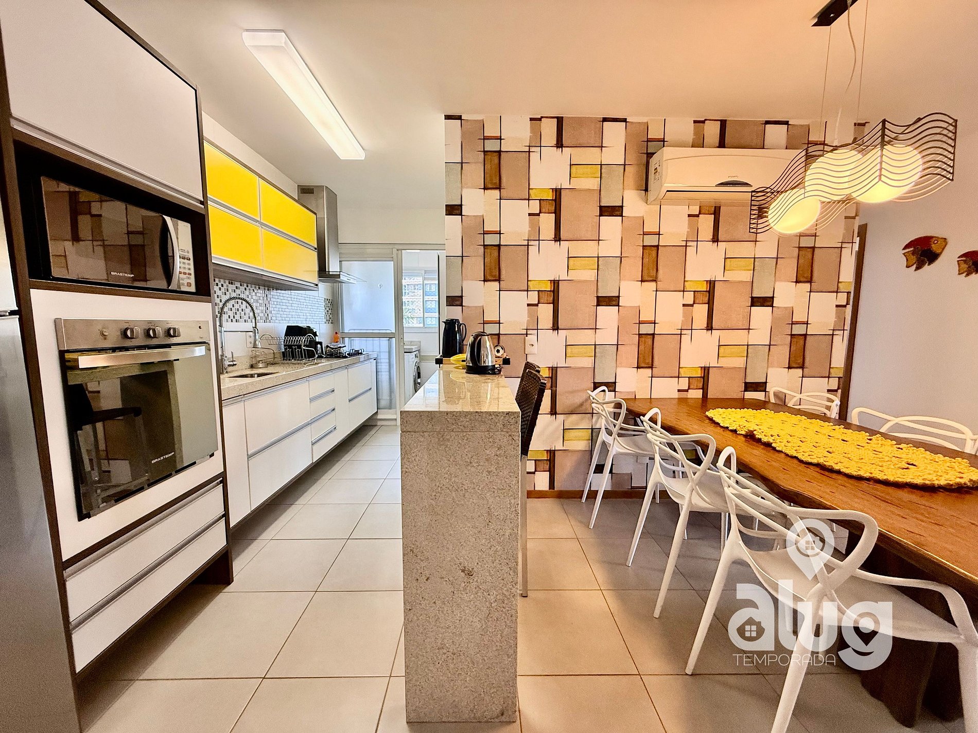 A sala integrada à cozinha completa oferece todo o conforto de um lar: Wi-Fi, Smart TV e espaço perfeito para relaxar após um dia de praia ou parque.