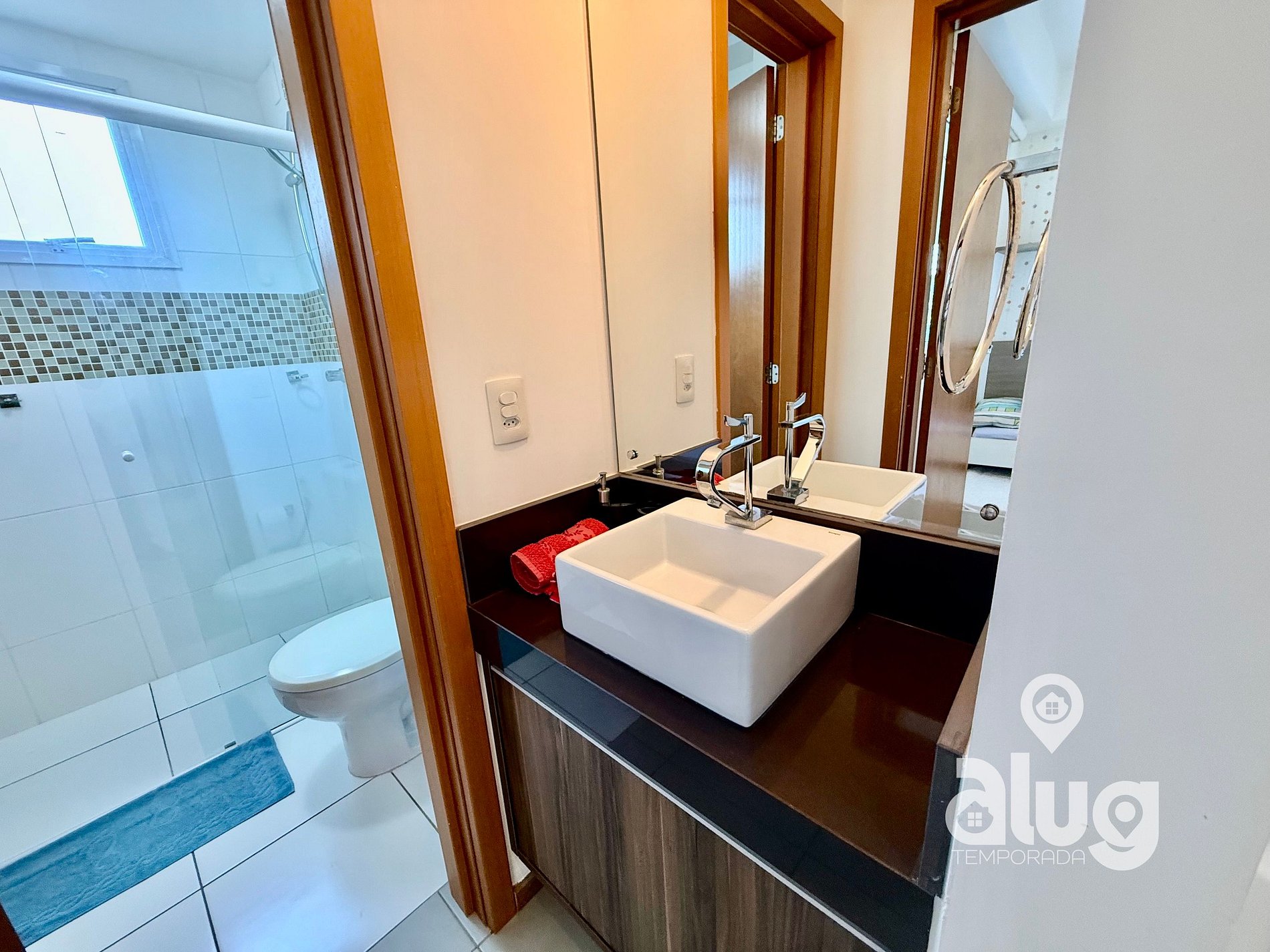 • 1 suíte com ar-condicionado, móveis planejados, cama queen-size e sacada com vista para o mar;