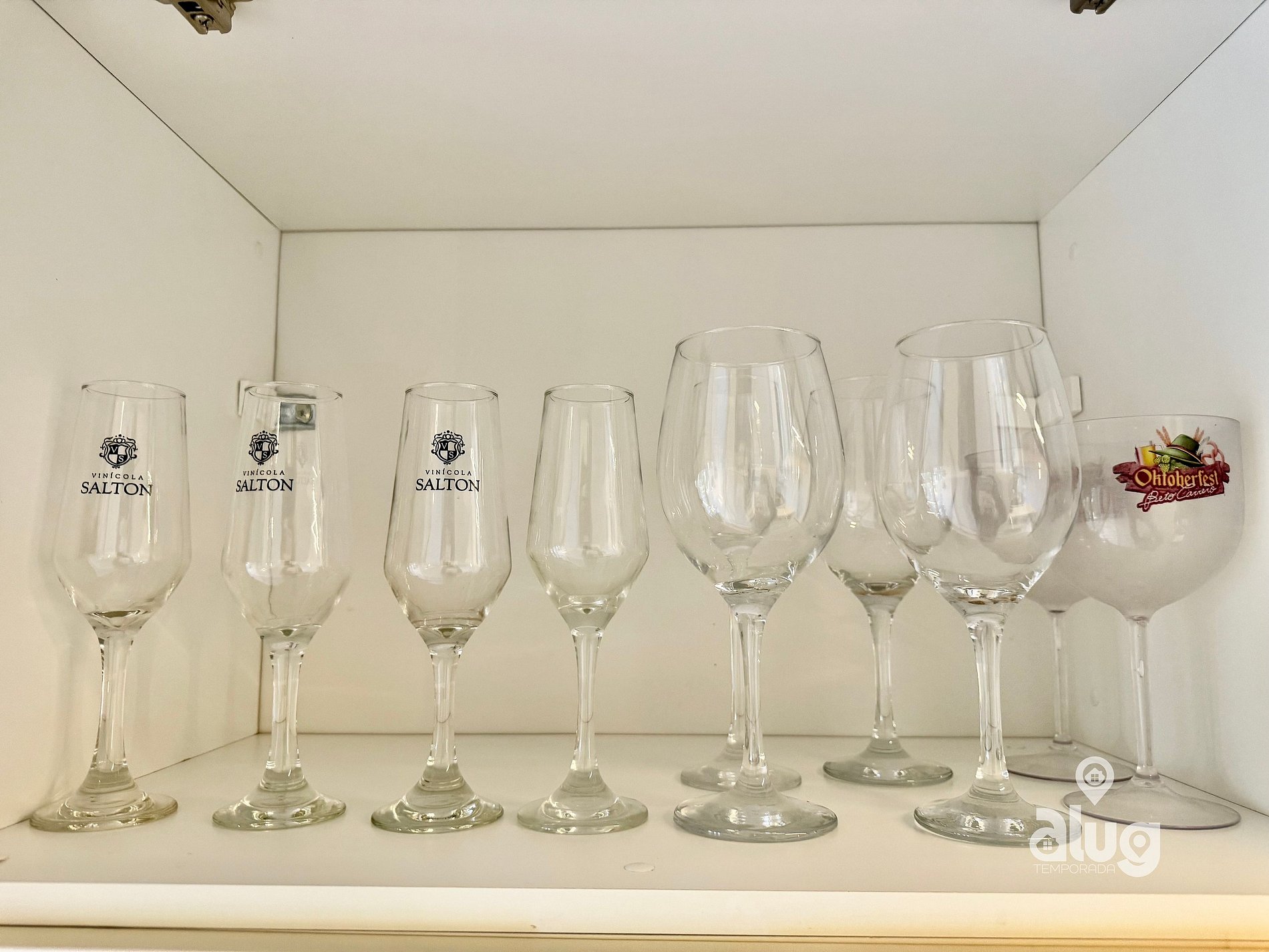 Oferecemos ainda todos os utensílios necessários para o dia a dia: pratos, copos, talheres, panelas, panos de prato, potes, utensílios para churrasco, faca, garfo e tábua de carne.