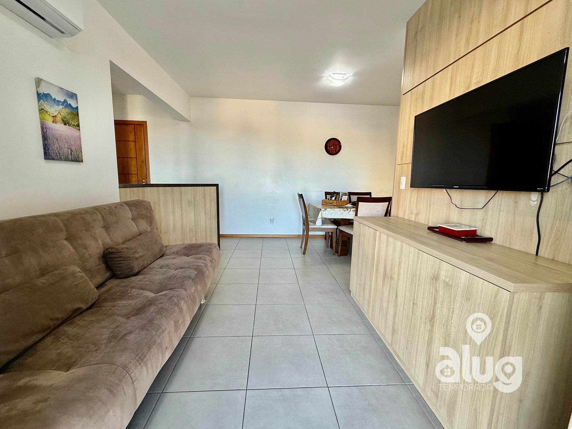 Ambiente climatizado com ar-condicionado, Smart TV, sofá confortável e mesa de jantar. A sala se integra à ampla sacada com churrasqueira e vista panorâmica para o mar, perfeita para relaxar ou aproveitar bons momentos em família.