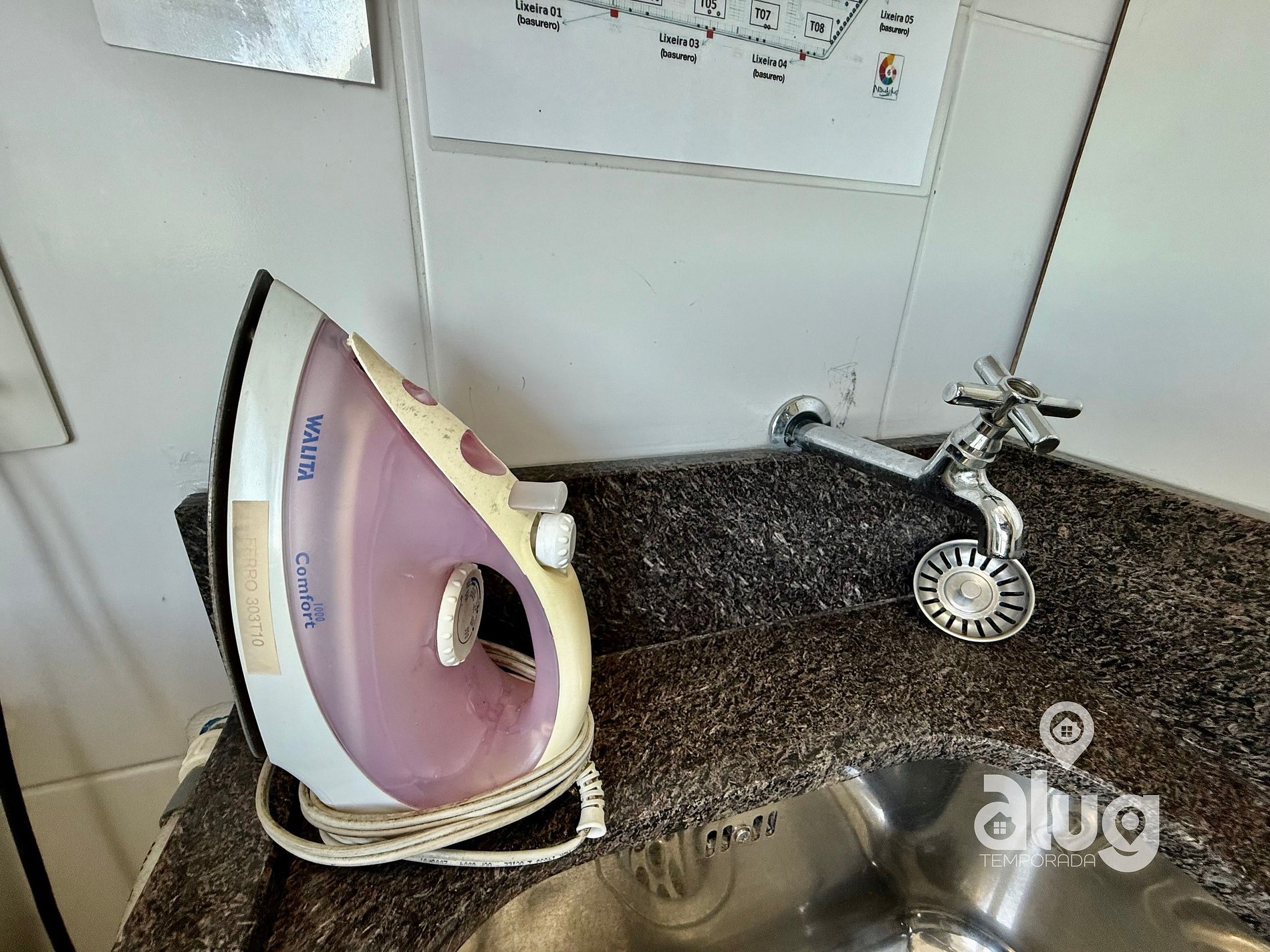 Totalmente equipada com geladeira, fogão, micro-ondas, purificador de água, sanduicheira e outros eletrodomésticos. Disponibilizamos todos os utensílios necessários: pratos, copos, talheres, panelas, panos de prato, potes, utensílios para churrasco, faca e tábua de carne.