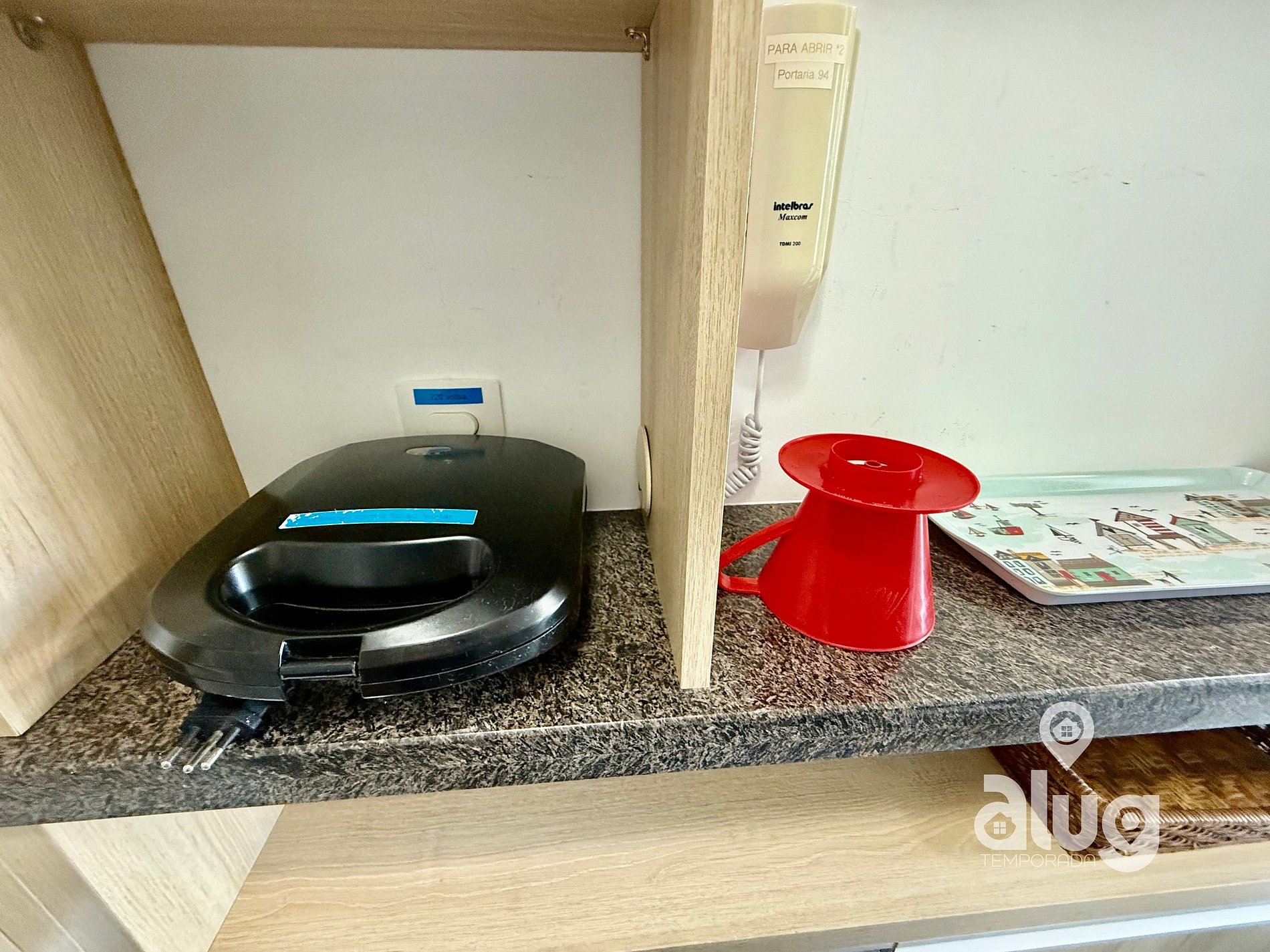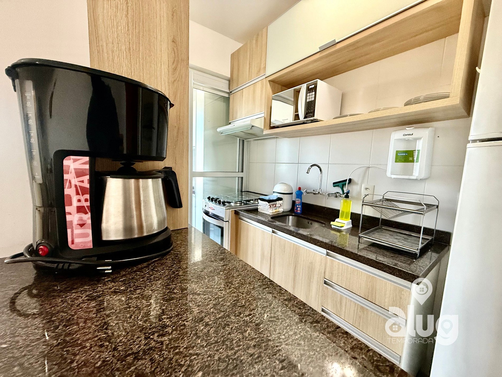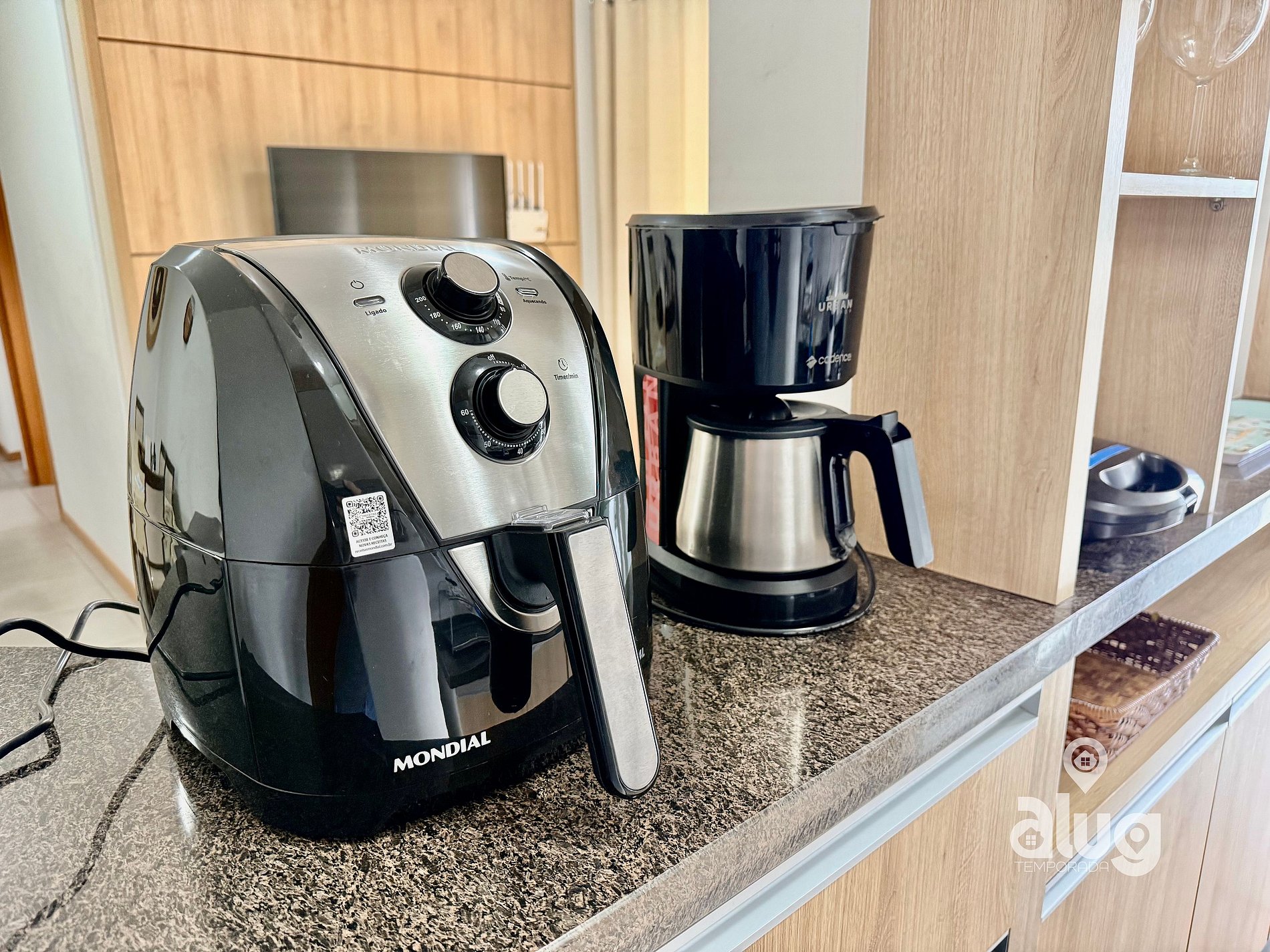 Totalmente equipada com geladeira, fogão, micro-ondas, purificador de água, sanduicheira e outros eletrodomésticos. Disponibilizamos todos os utensílios necessários: pratos, copos, talheres, panelas, panos de prato, potes, utensílios para churrasco, faca e tábua de carne.