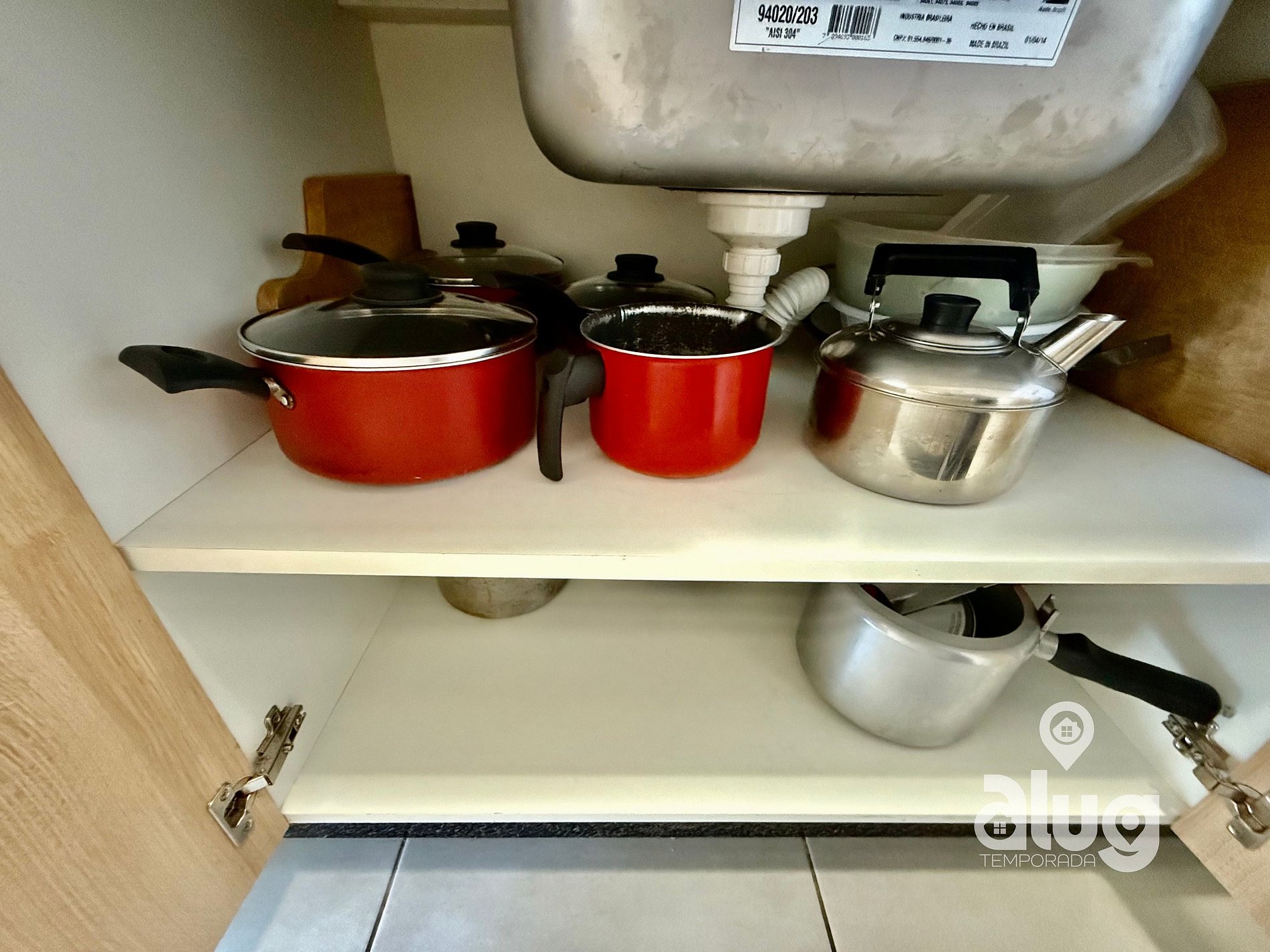 - Cozinha completa com utensílios, geladeira, fogão e pequenos eletros.