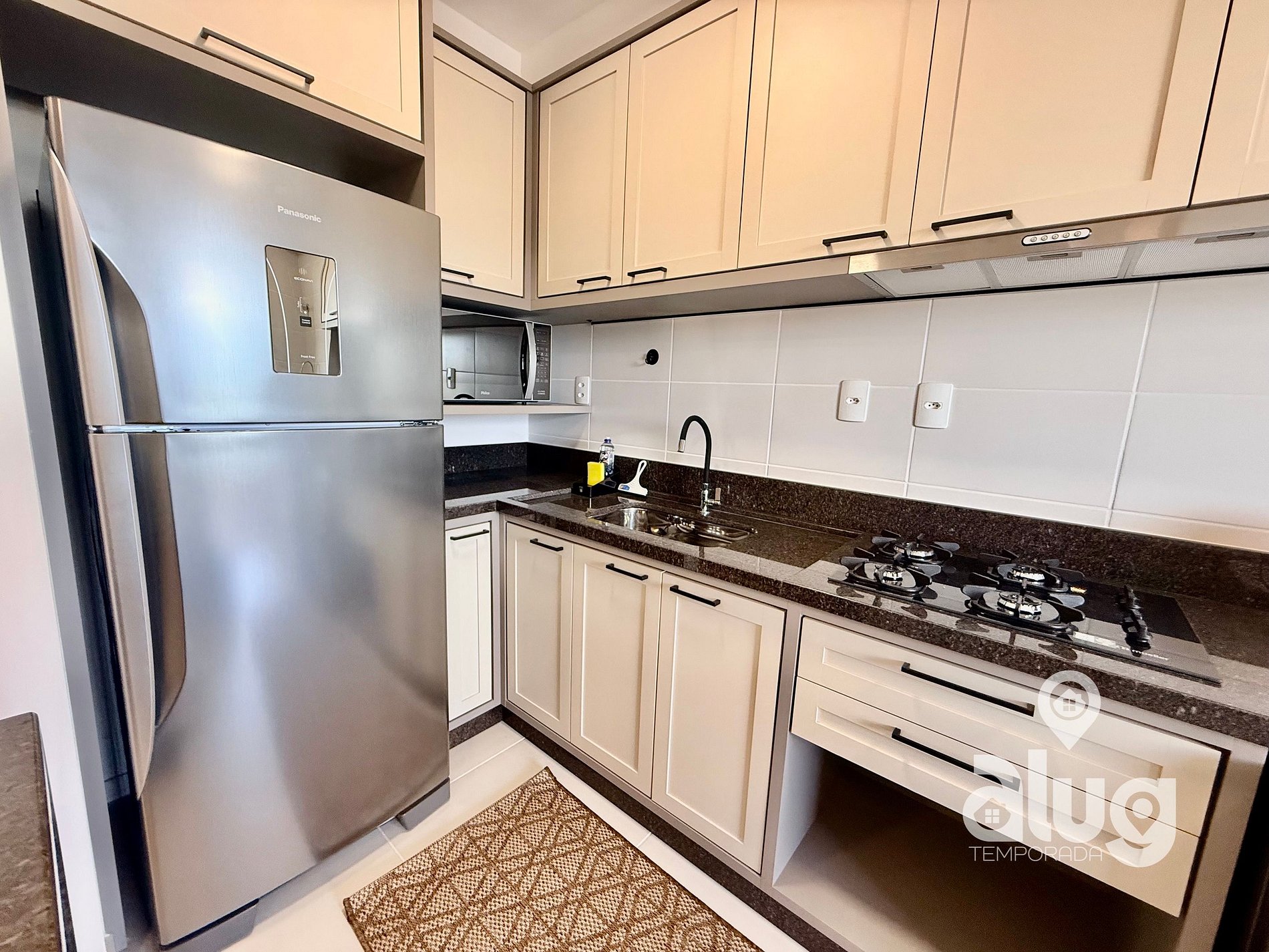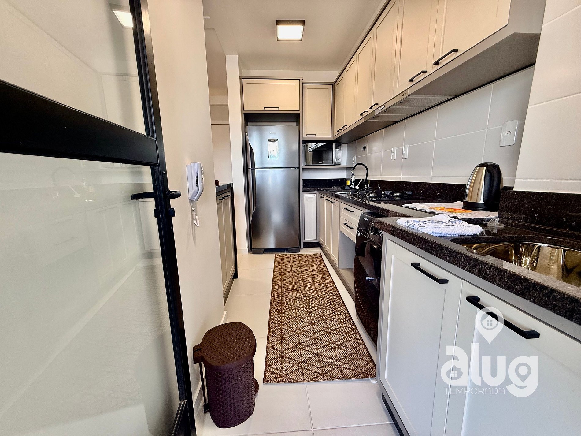 • Cozinha completa equipada com utensílios, cooktop, geladeira, micro-ondas e máquina de lavar roupas frontal;
