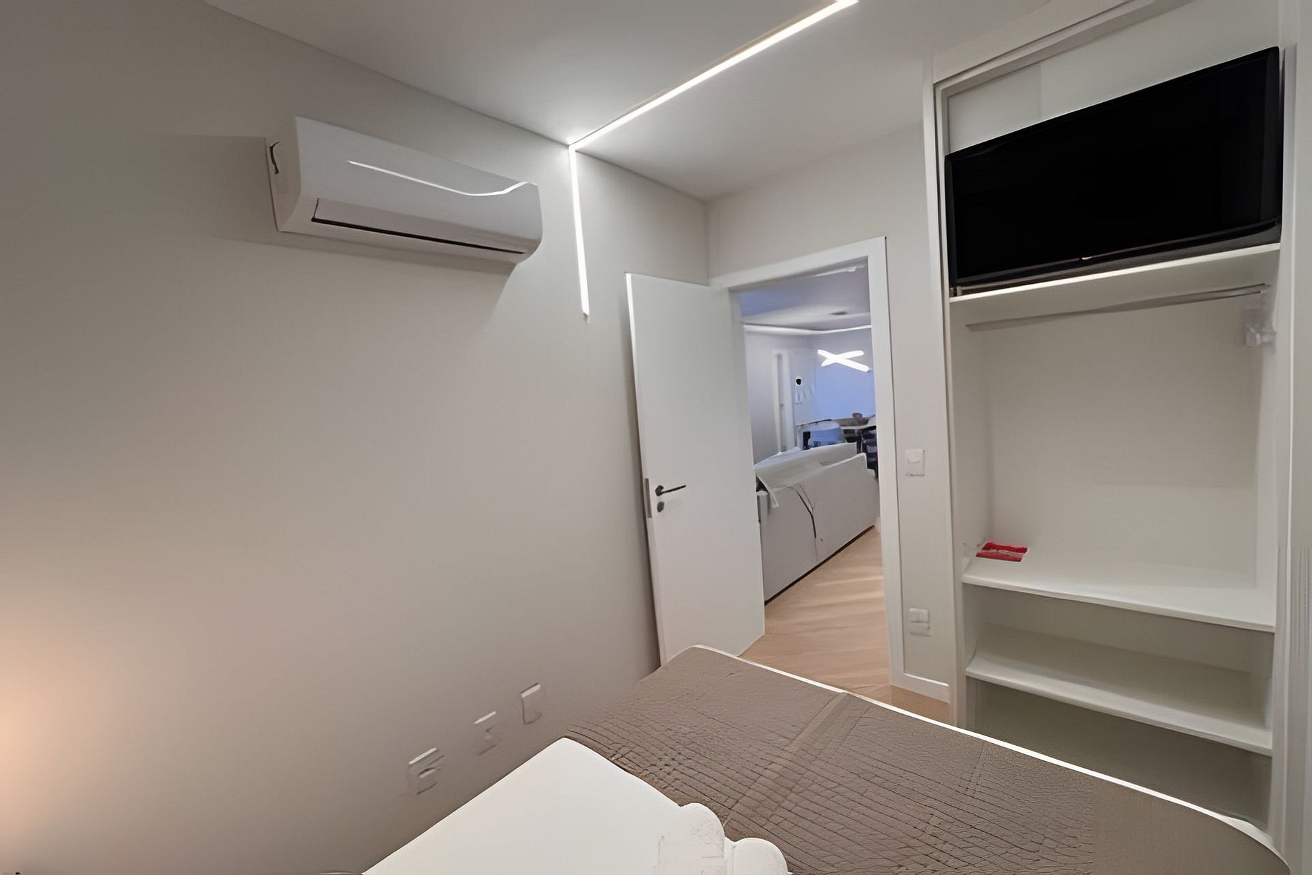 Apartamento com 4 quartos com camas de casal Quarto 1: 1 Cama de Casal + 1 Cama Auxiliar Quarto 2: 1 Cama Queen Quarto 3: 1 Cama de Casal Suíte: 1 Cama Queen + 1 Cama Auxiliar. Todos com TV e Ar condicionado.
