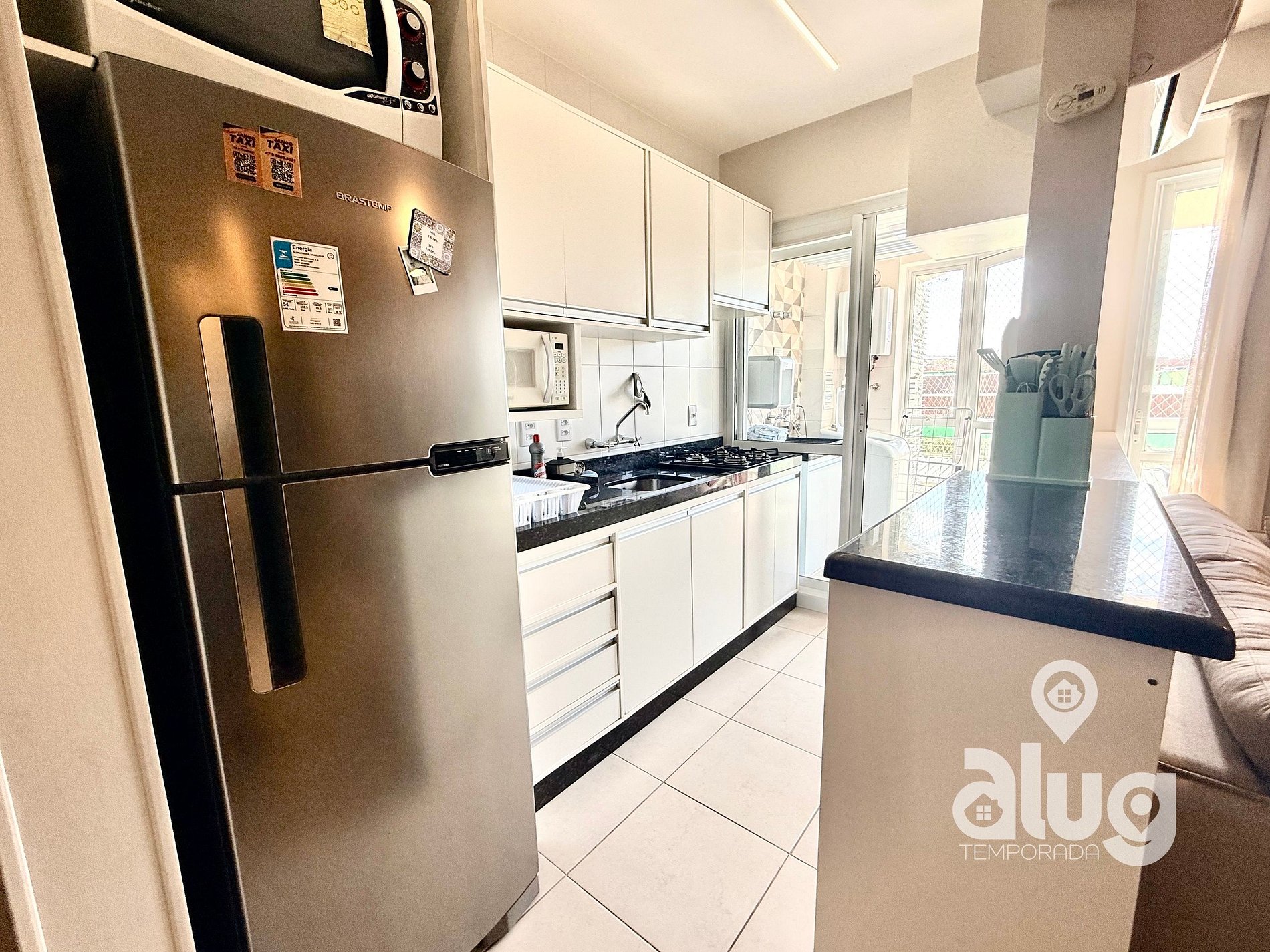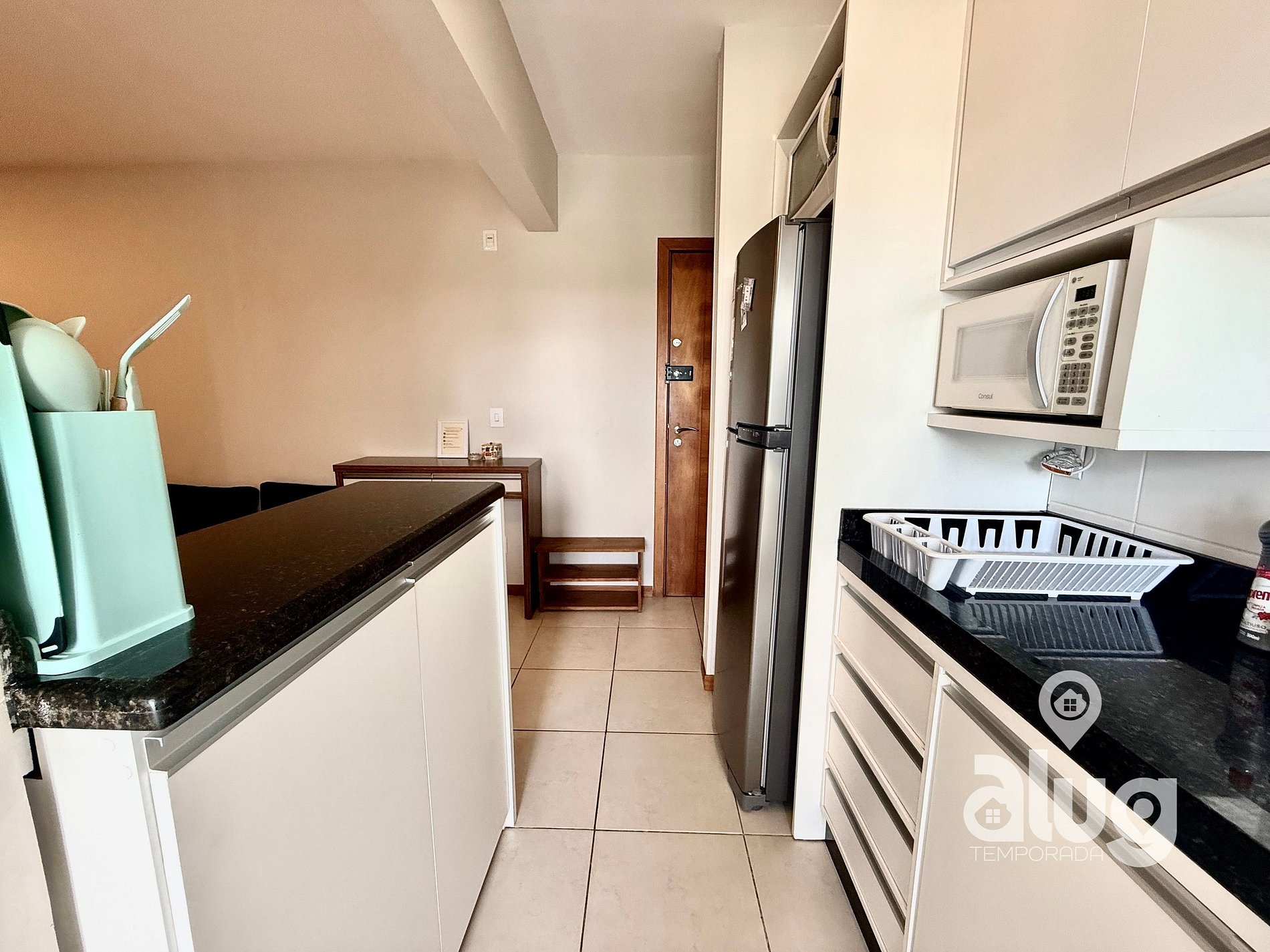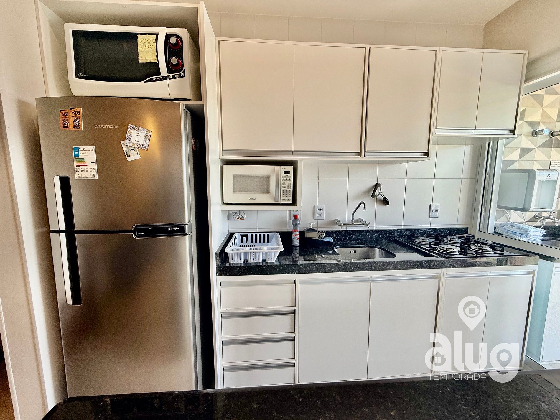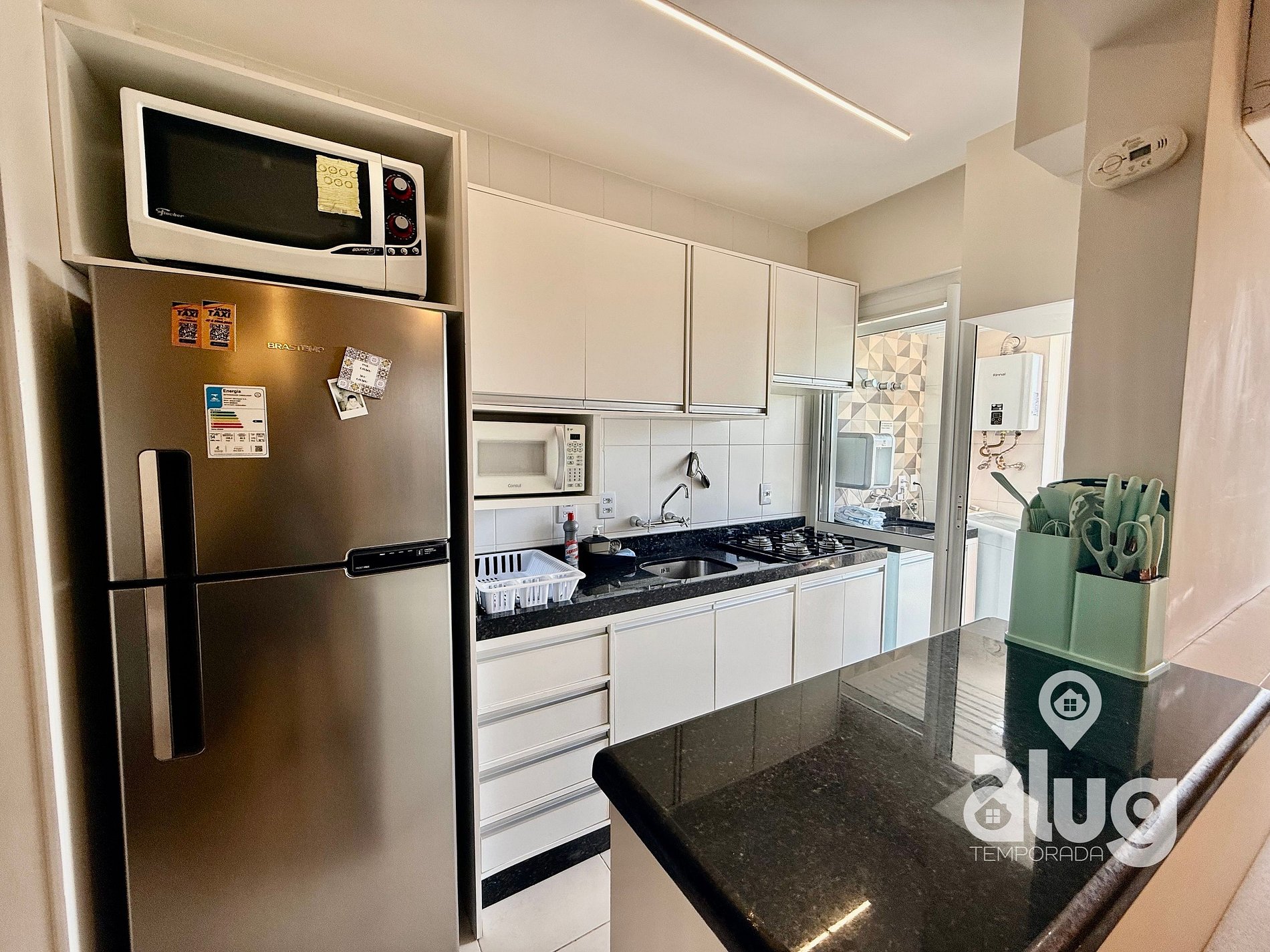 O apartamento dispõe de cozinha completa: Geladeira, microondas, fogão, cafeteira, torradeira, pipoqueira e outros eletros. Também inclui utensílios - pratos, copos, talheres, panelas, panos de prato, potes e utensílios de churrasco, faca, garfo e tábua de carne.