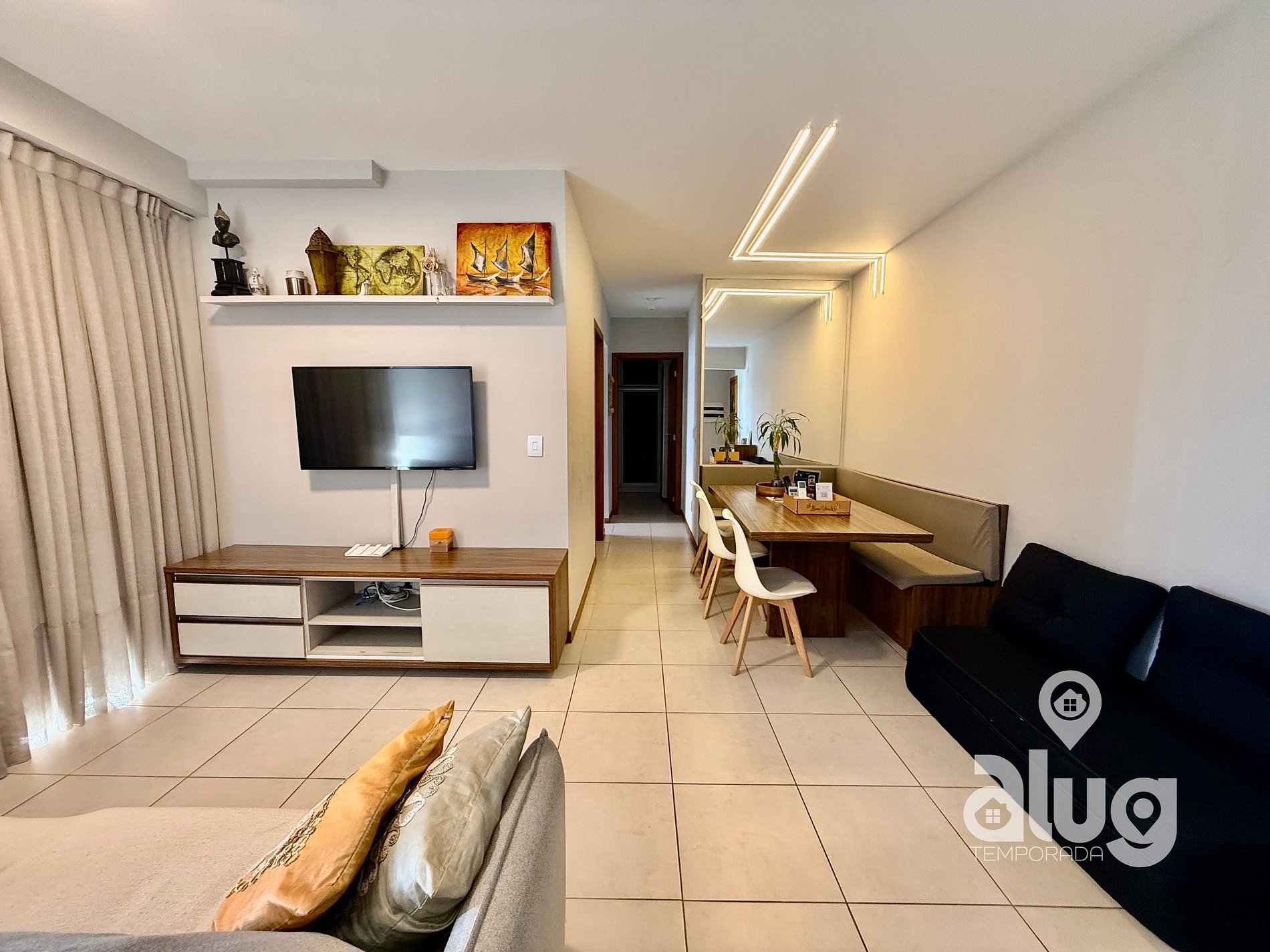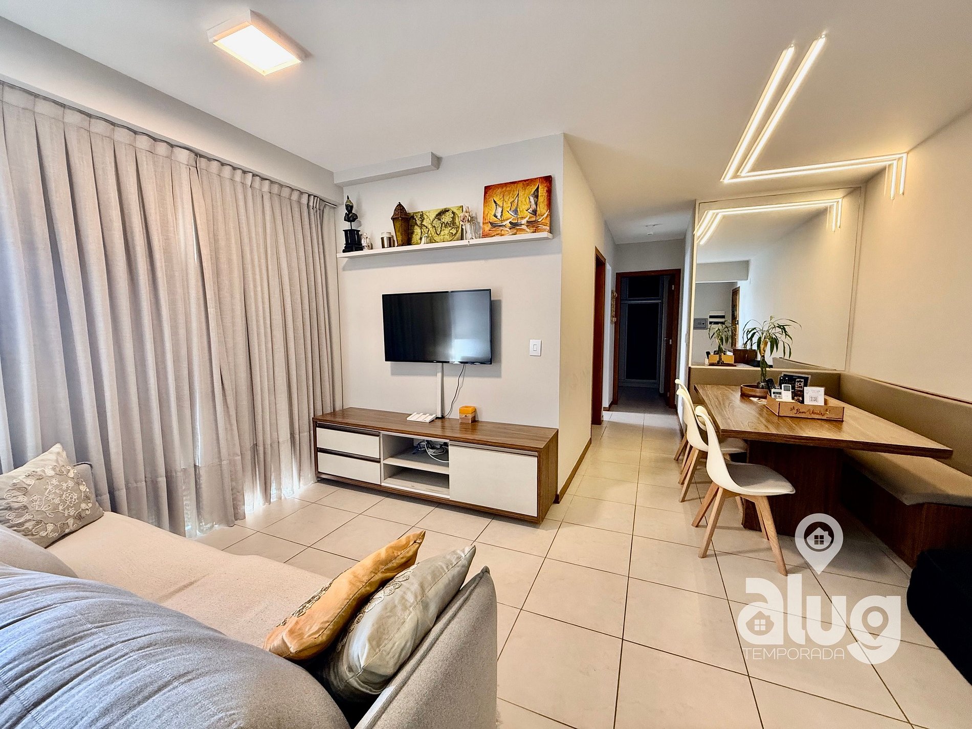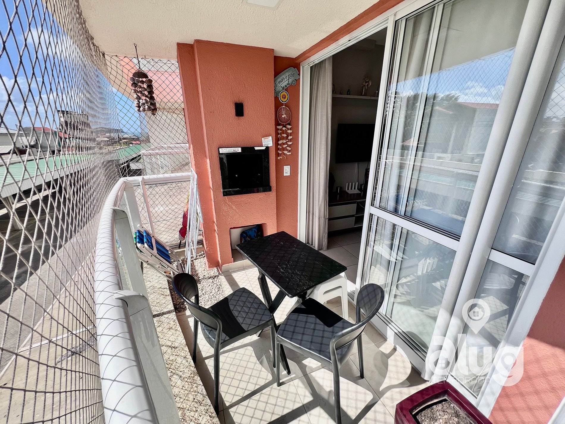 Na sala temos Ar condicionado, Smart TV 43” (Netflix, Youtube e outros), Confortável Sofá e mesa de jantar. Saindo da sala você tem acesso a uma excelente sacada com churrasqueira e tela de proteção para segurança das crianças.