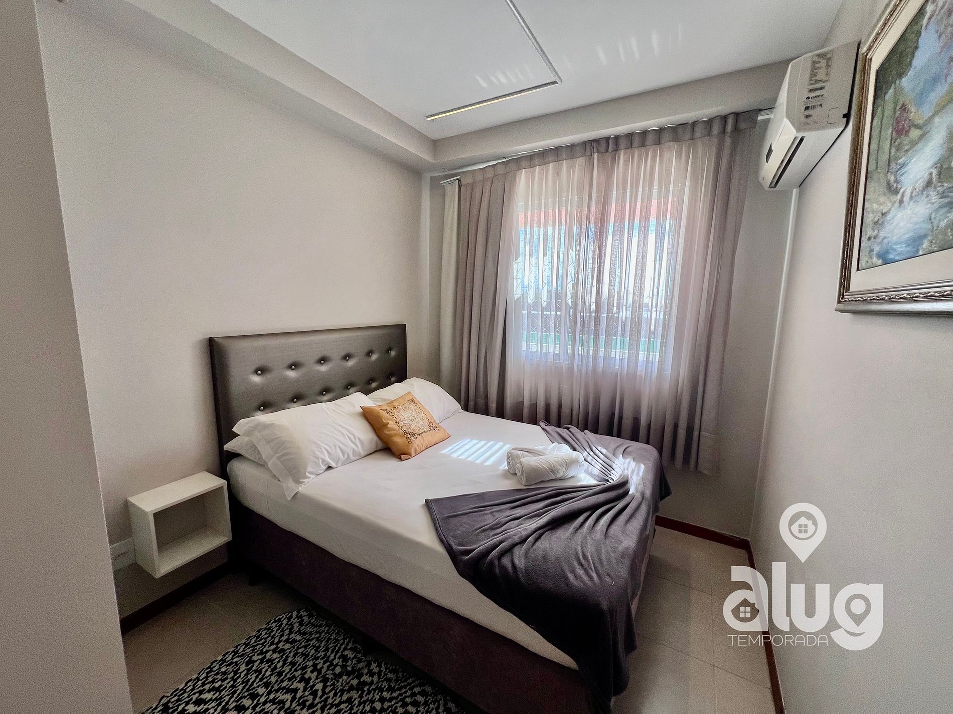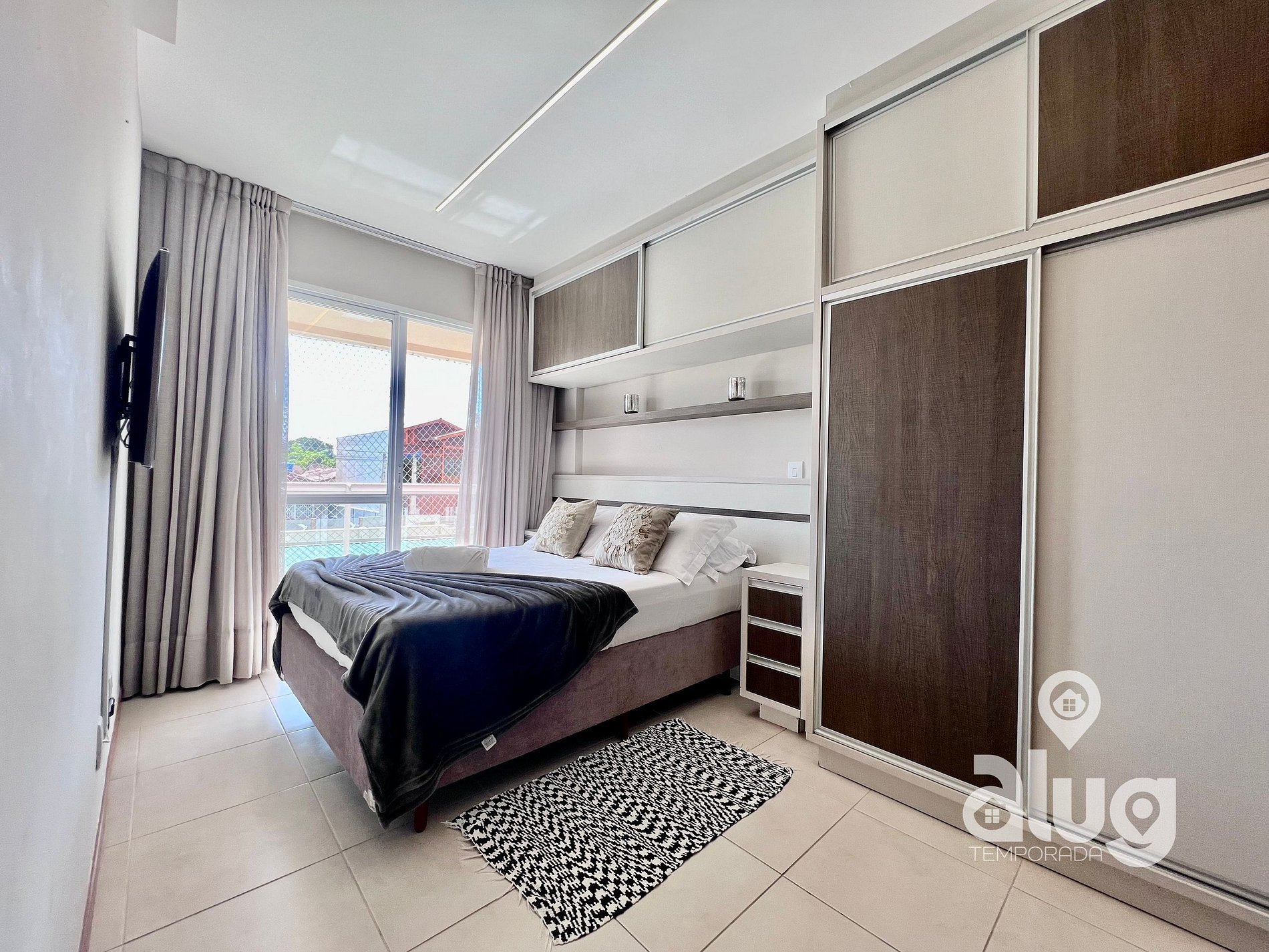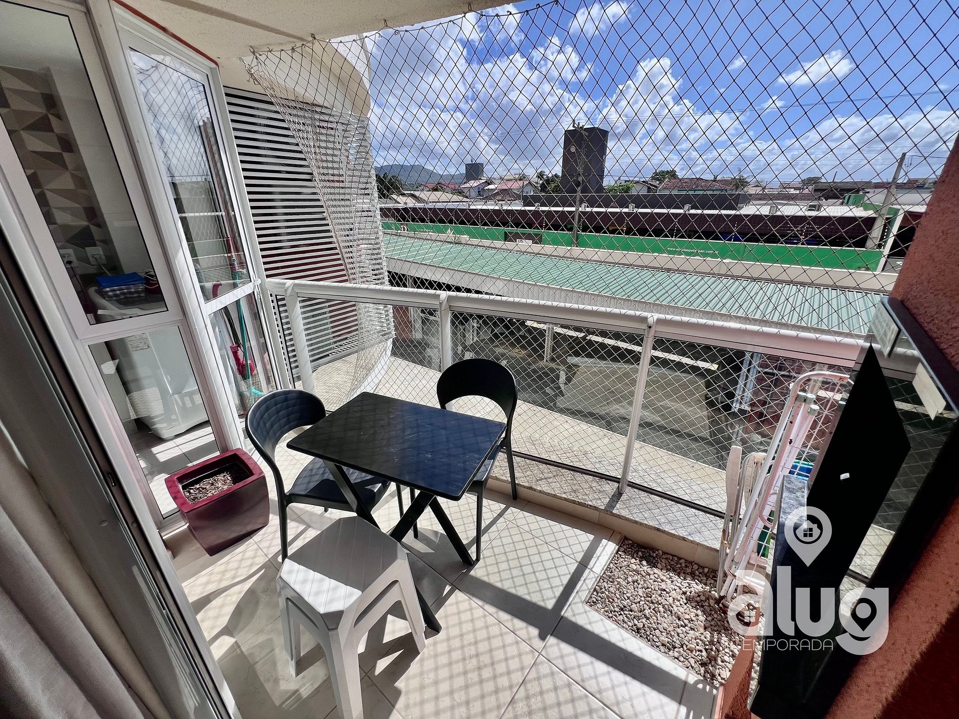Suíte: Equipada com Ar condicionado, Cama de casal, Smart TV, Toalheiro Elétrico, sacada com tela de proteção e móveis planejados.