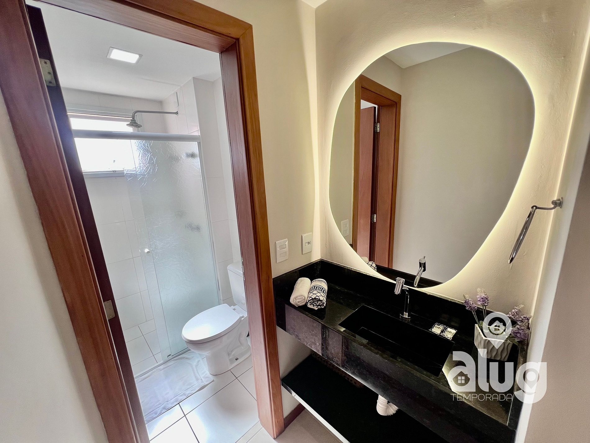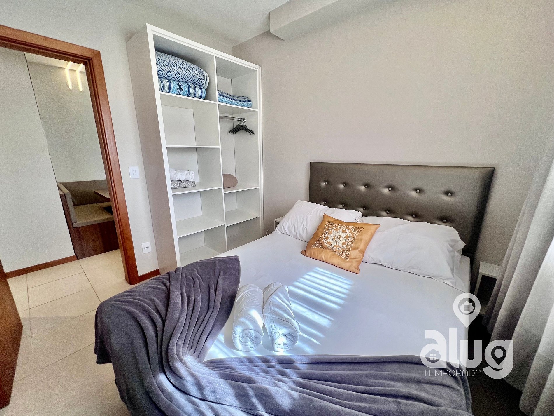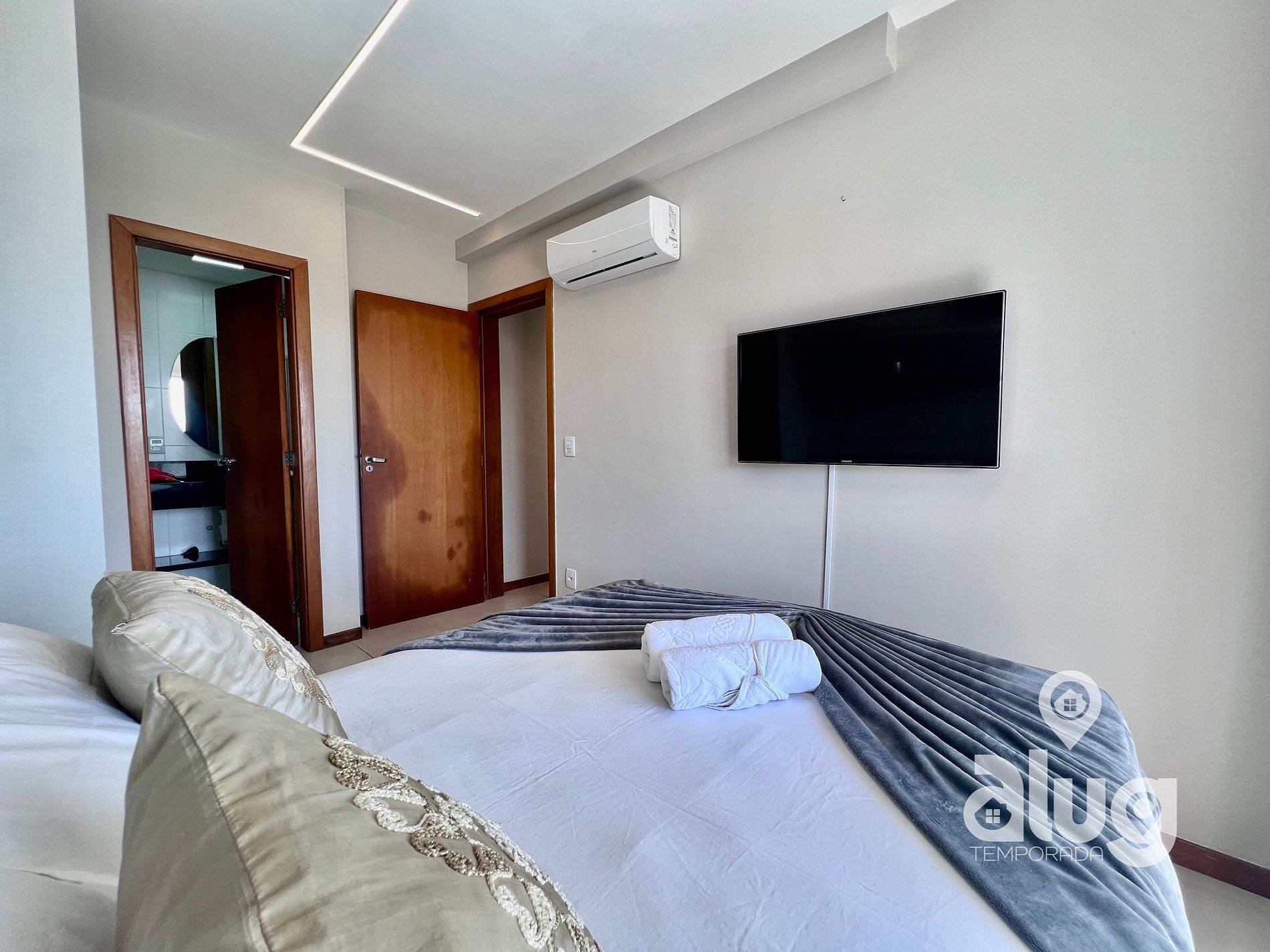 Suíte: Equipada com Ar condicionado, Cama de casal, Smart TV, Toalheiro Elétrico, sacada com tela de proteção e móveis planejados.