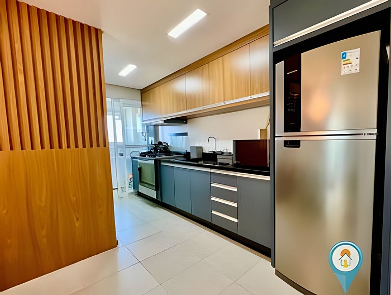 - Cozinha completa com utensílios, geladeira, fogão e pequenos eletros.
