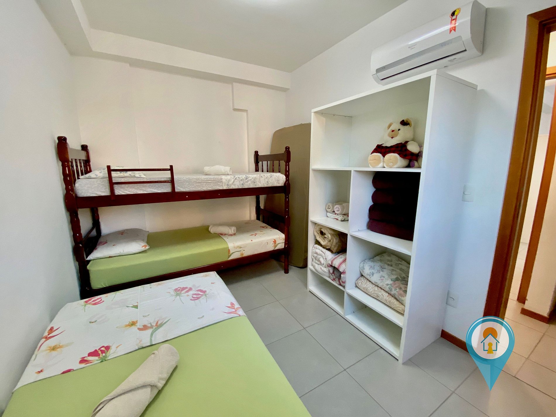 Suíte: Equipada com Ar condicionado, Cama de casal, sacada com tela de proteção e móveis.