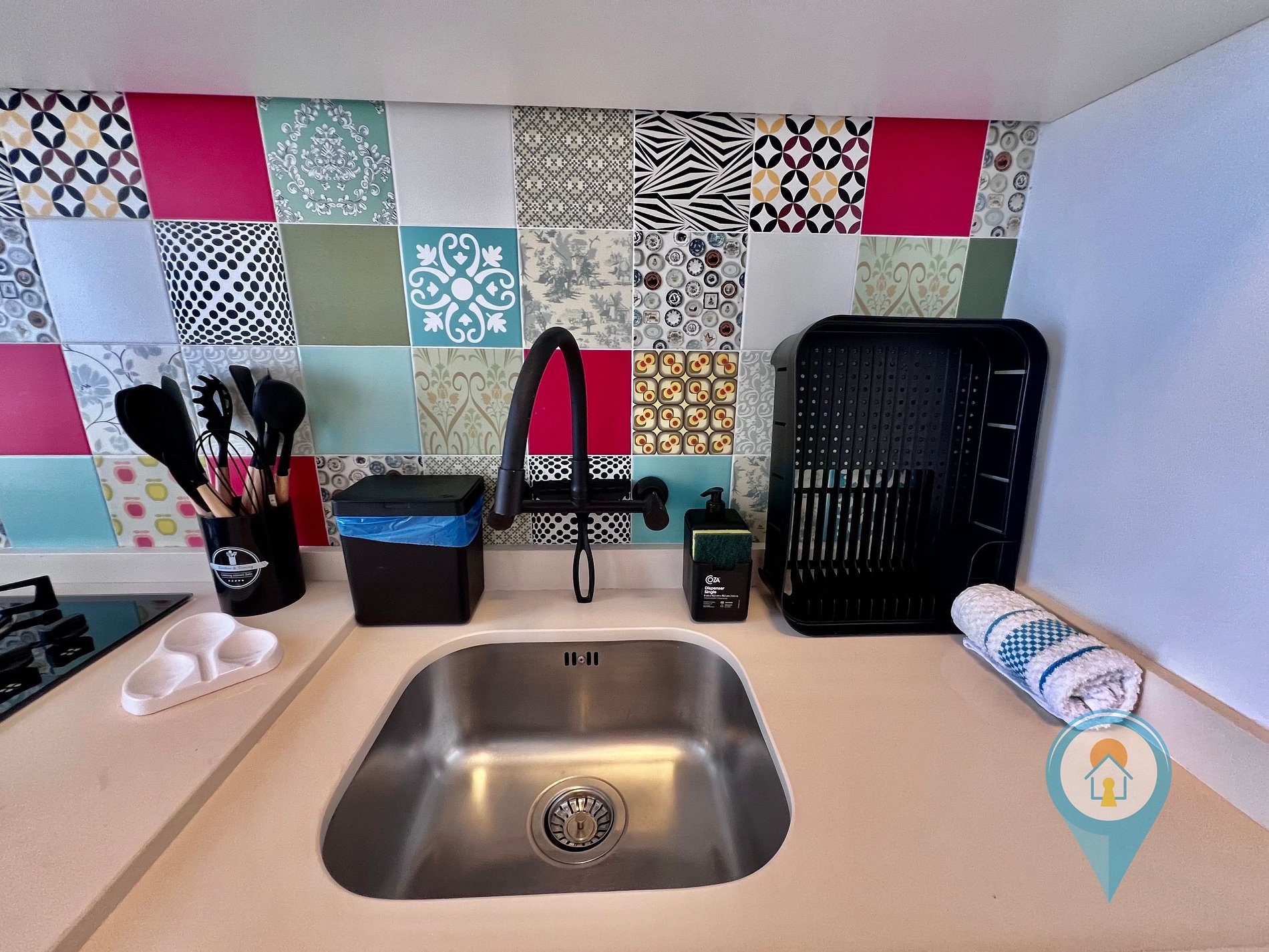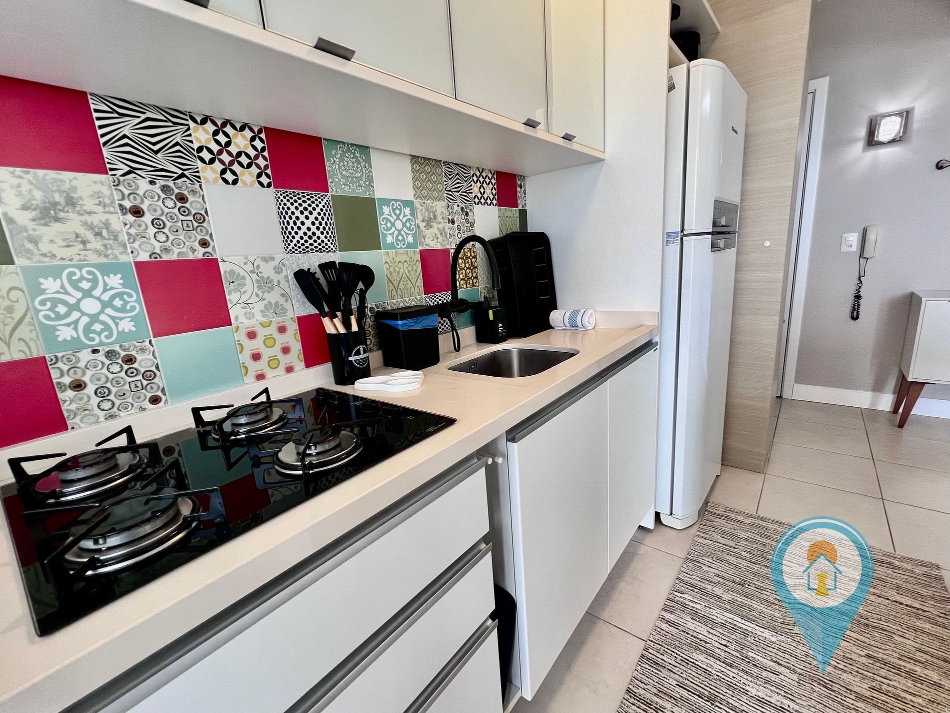 O apartamento dispõe de cozinha completa: Geladeira, microondas, fogão, cafeteira e outros eletros. Também inclui utensílios - pratos, copos, talheres, panelas, panos de prato, potes e utensílios de churrasco, faca, garfo e tábua de carne.