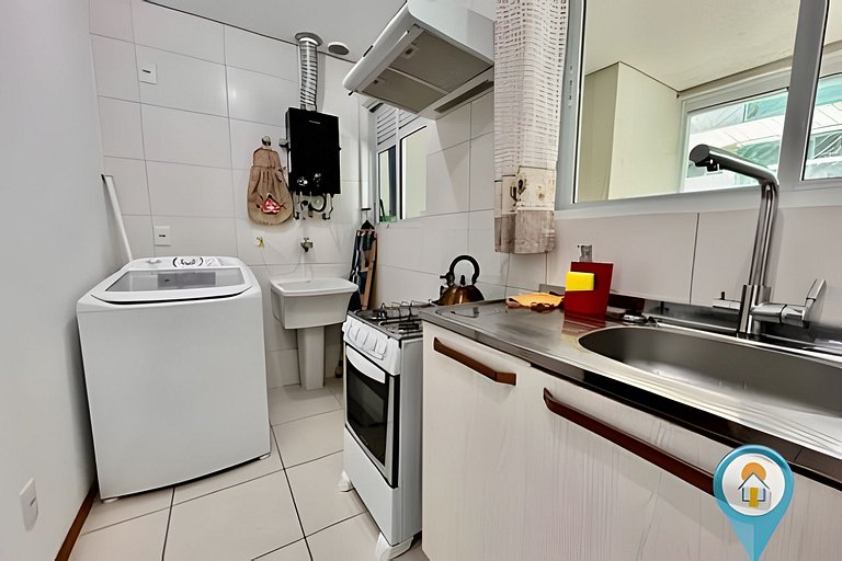 A cozinha é equipada com geladeira, micro-ondas, cooktop, forno e lava-louças — ideal também para estadias longas.