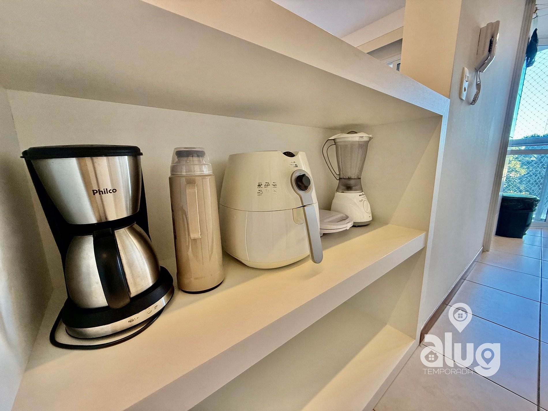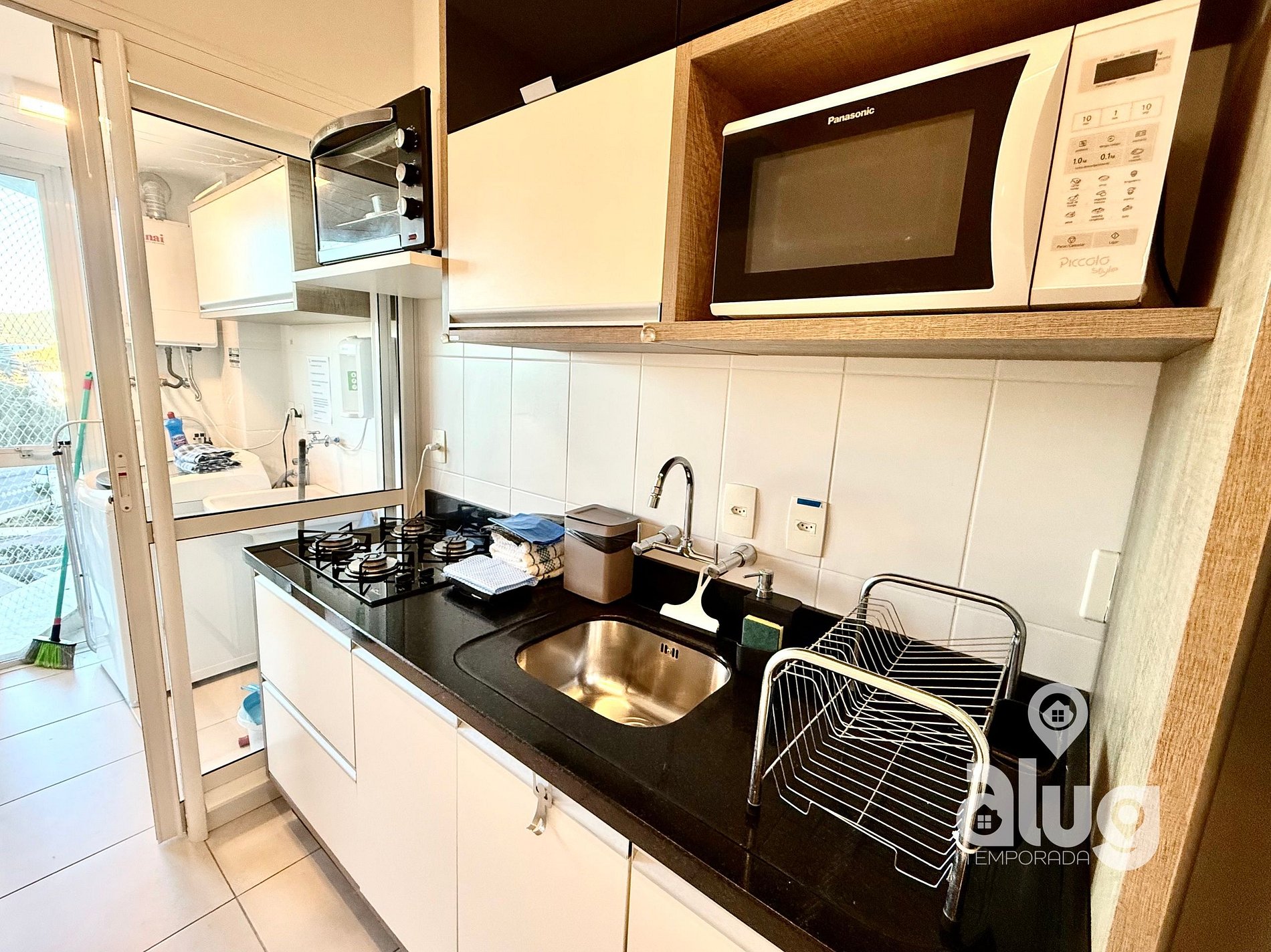 Cozinha completa: equipada com geladeira, fogão, micro-ondas, purificador de água, cafeteira, sanduicheira e outros eletrodomésticos essenciais.