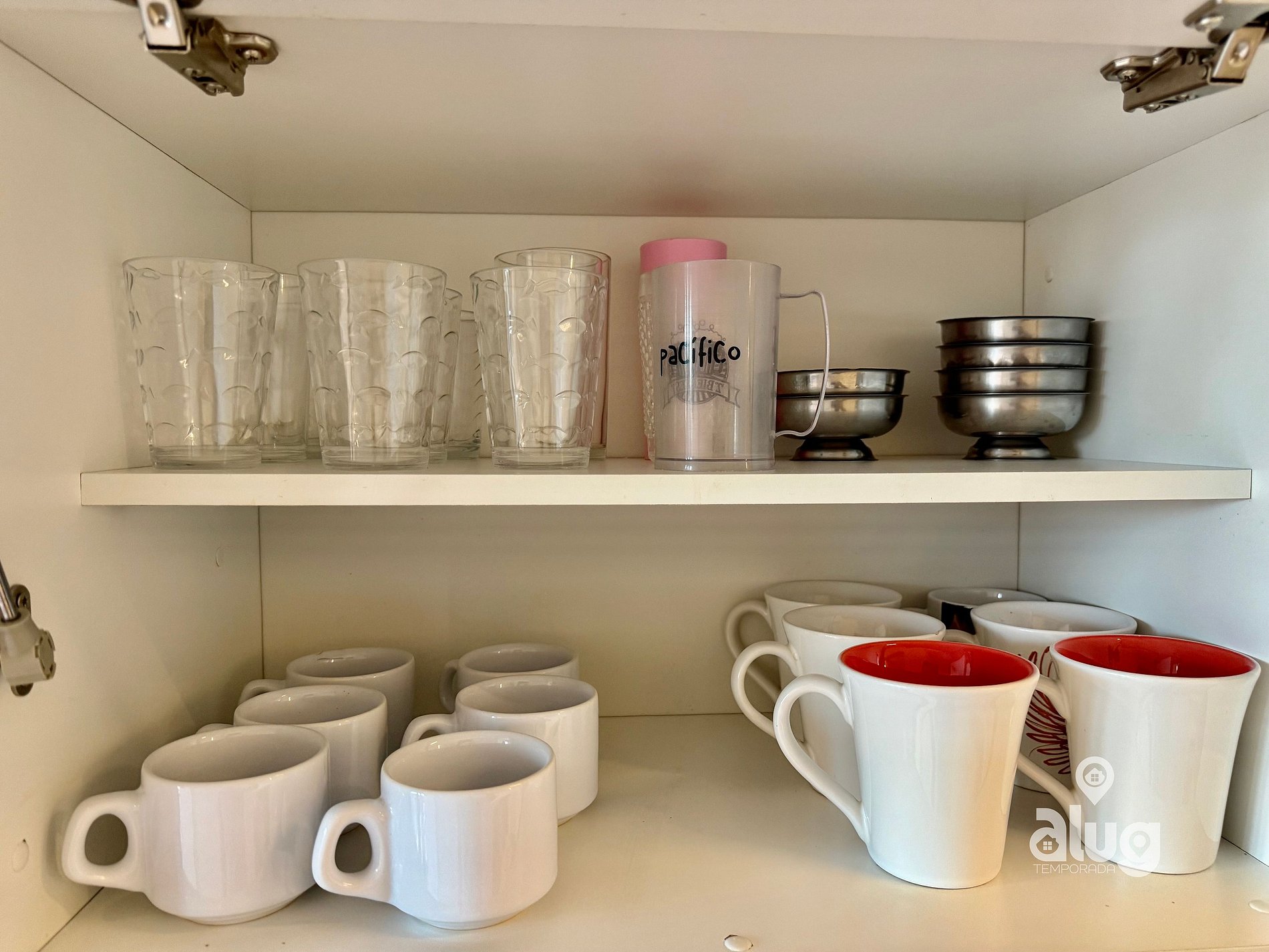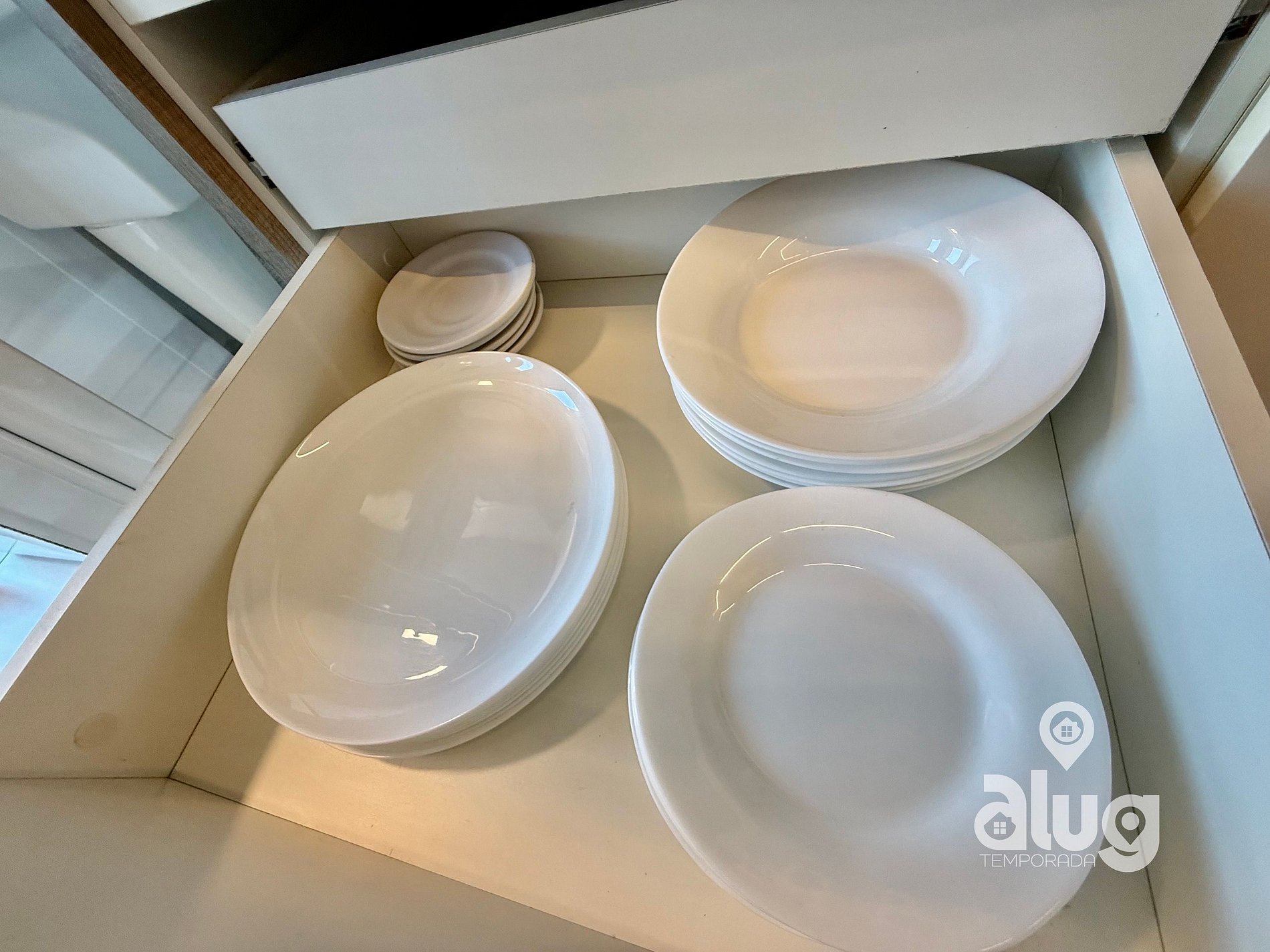 Oferecemos ainda todos os utensílios necessários para o dia a dia: pratos, copos, talheres, panelas, panos de prato, potes, utensílios para churrasco, faca, garfo e tábua de carne.