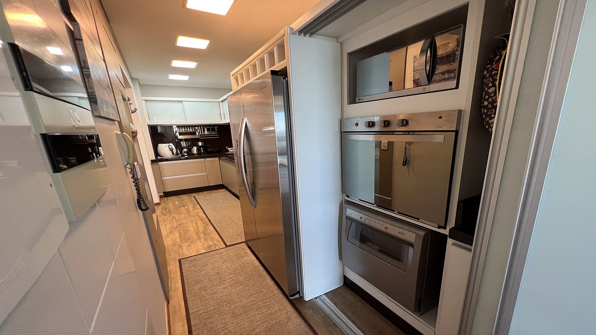 - Cozinha completa com utensílios, geladeira, fogão, lava louça, microondas, cafeteira, sanduicheira, copos e talheres.