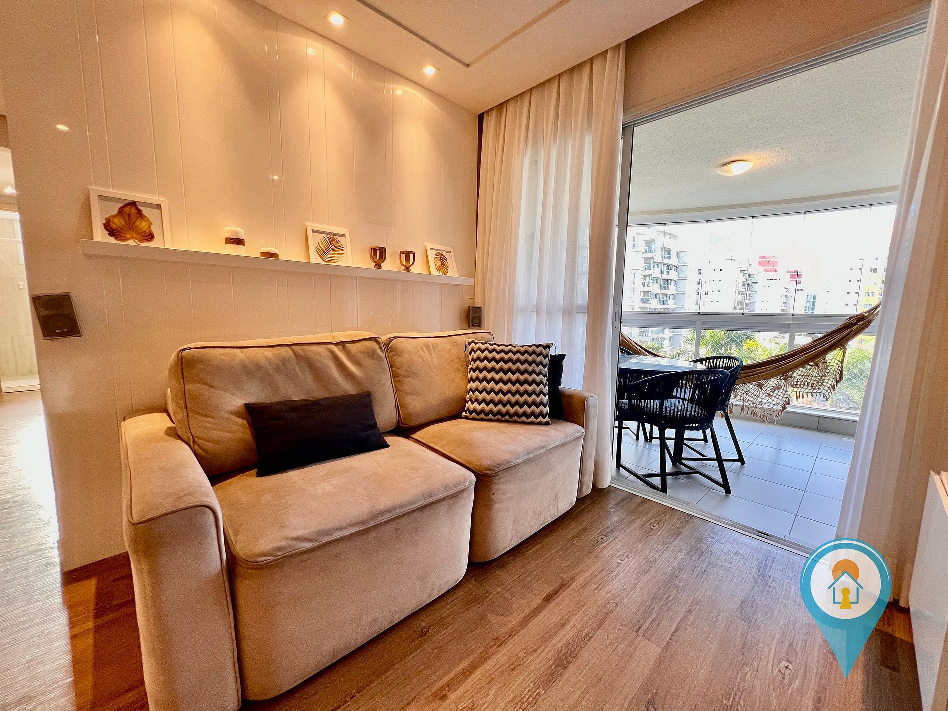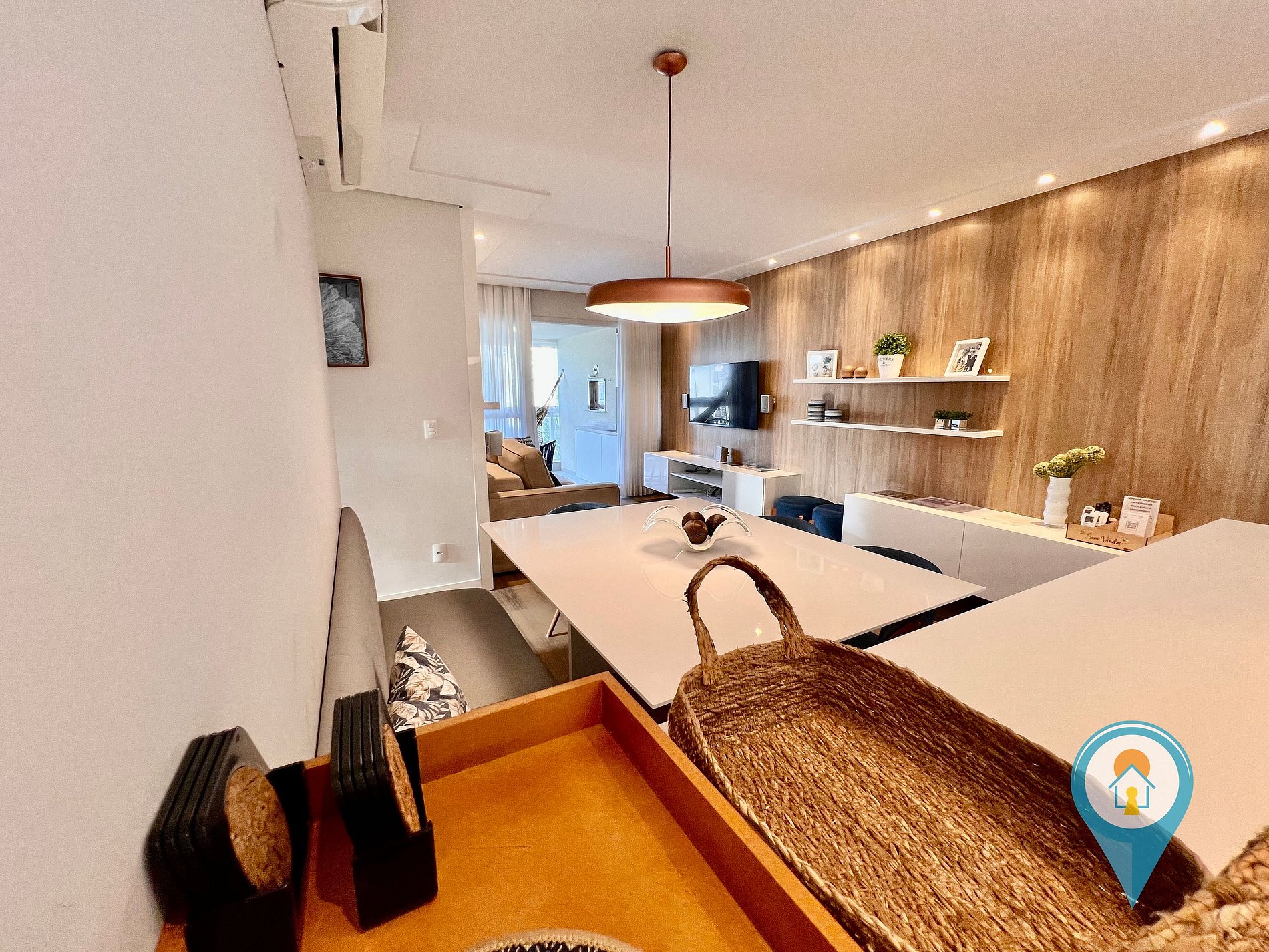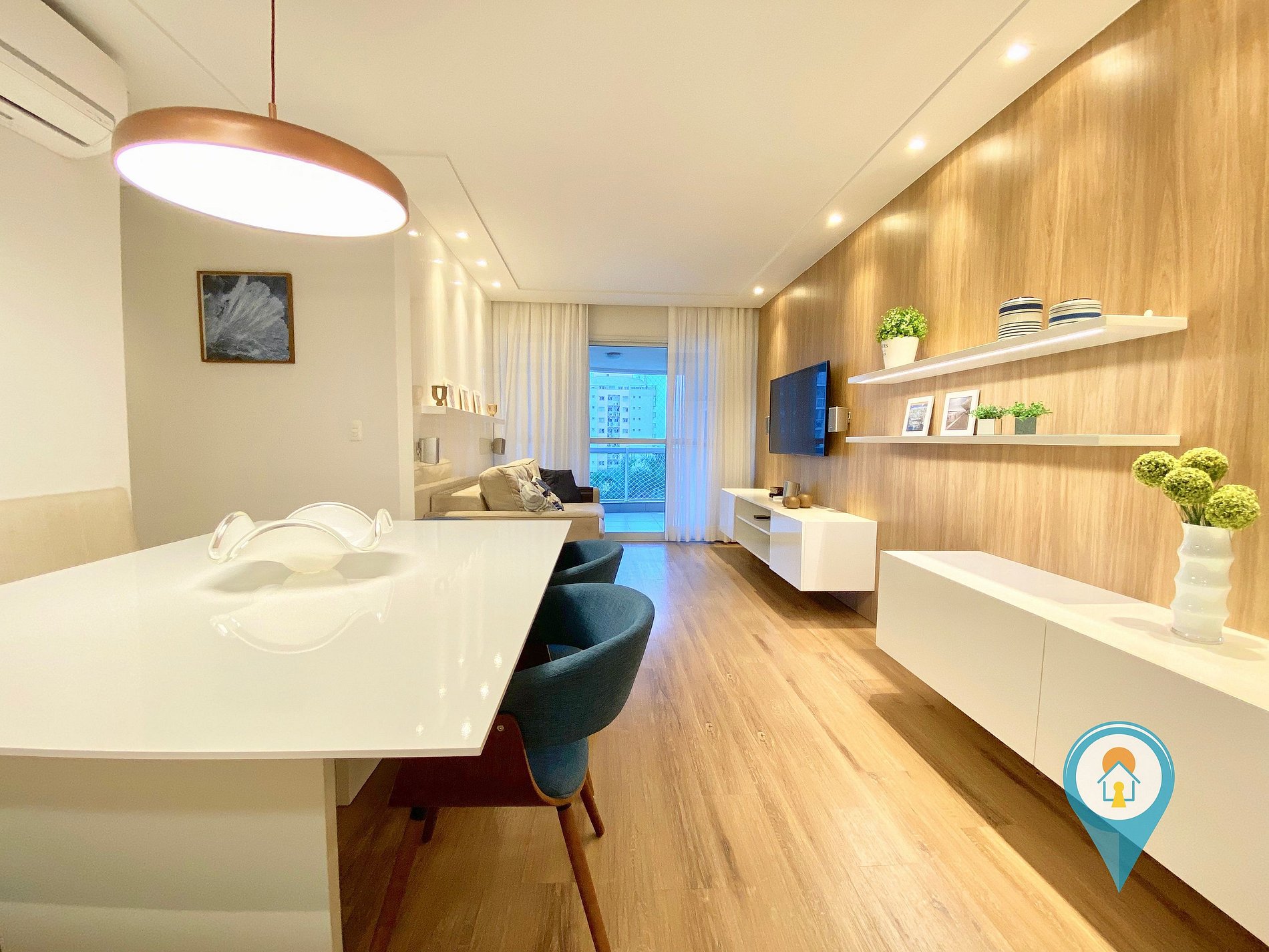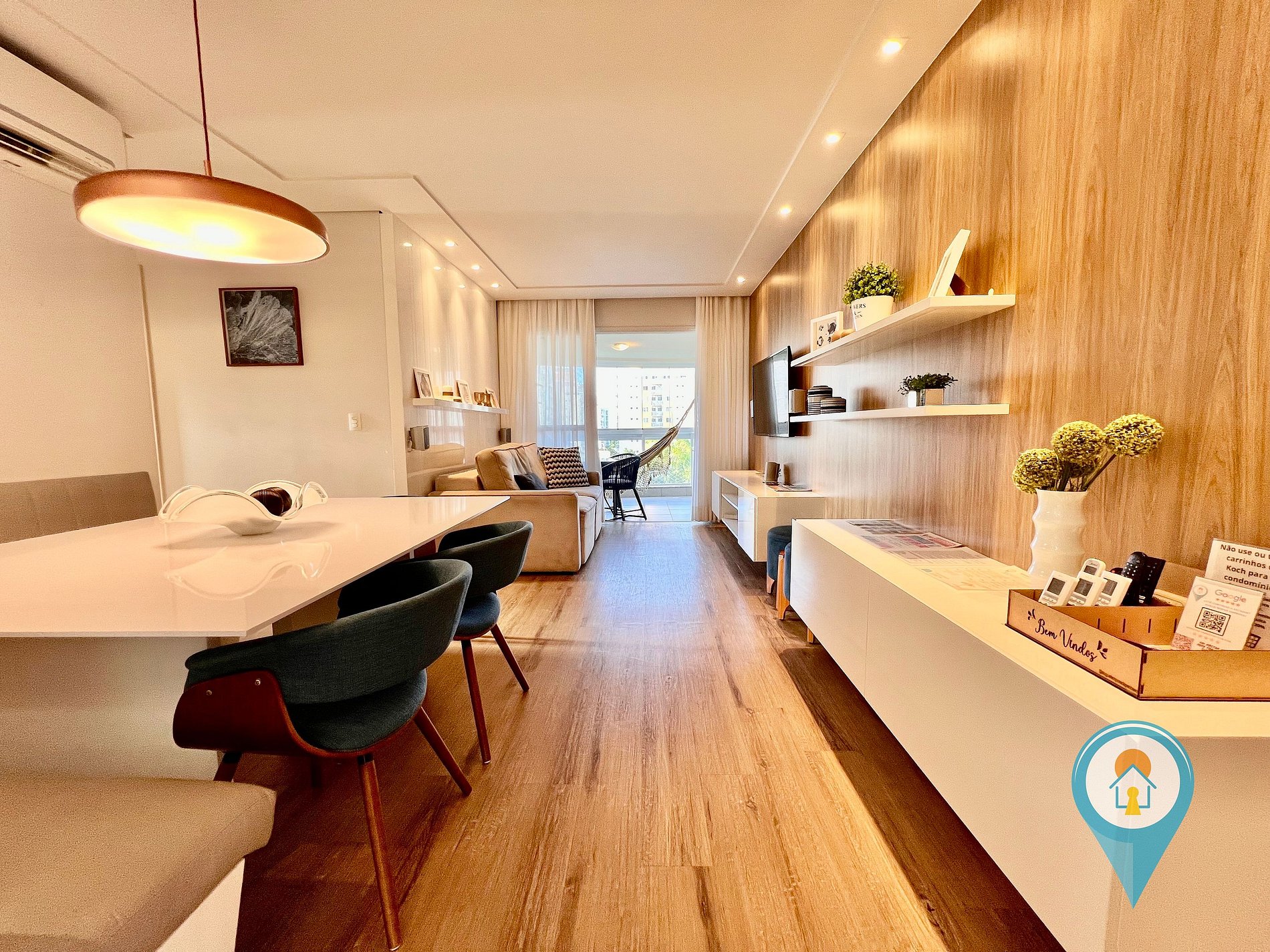 Na sala temos Ar condicionado, SmartTV 50”, BTV, Confortável Sofá e mesa de jantar. Saindo da sala você tem acesso a uma excelente sacada com vista para piscina, churrasqueira e tela de proteção para segurança das crianças.