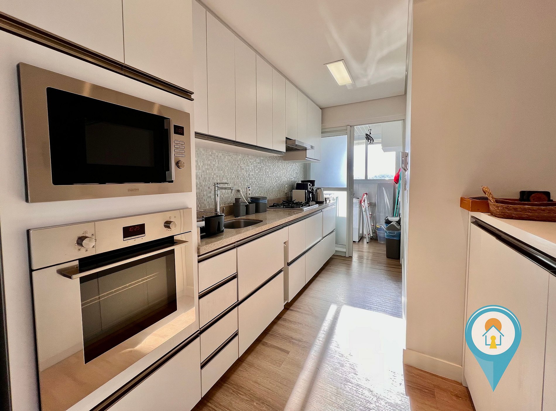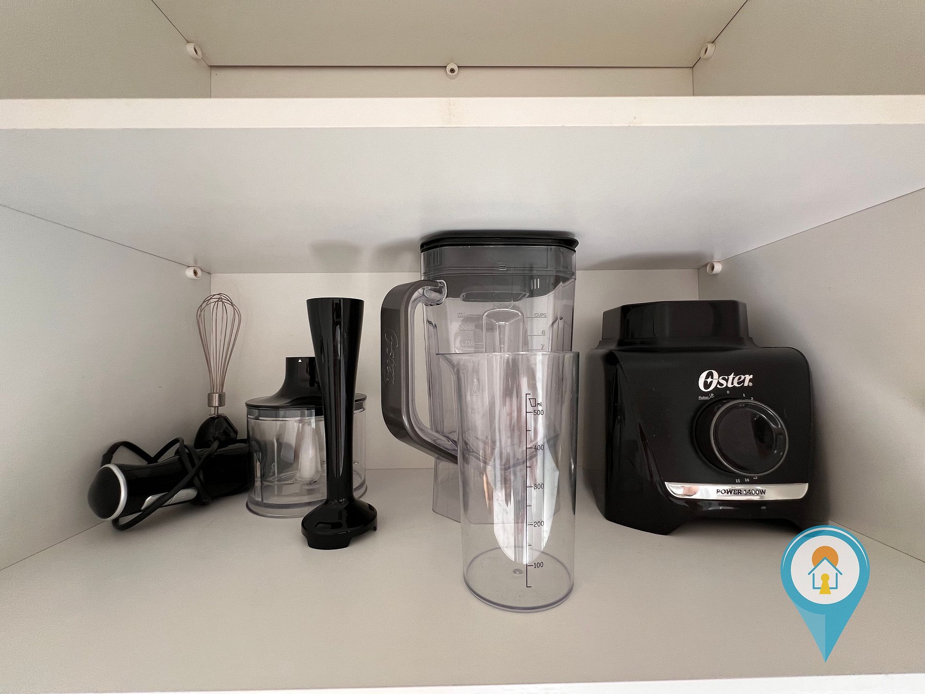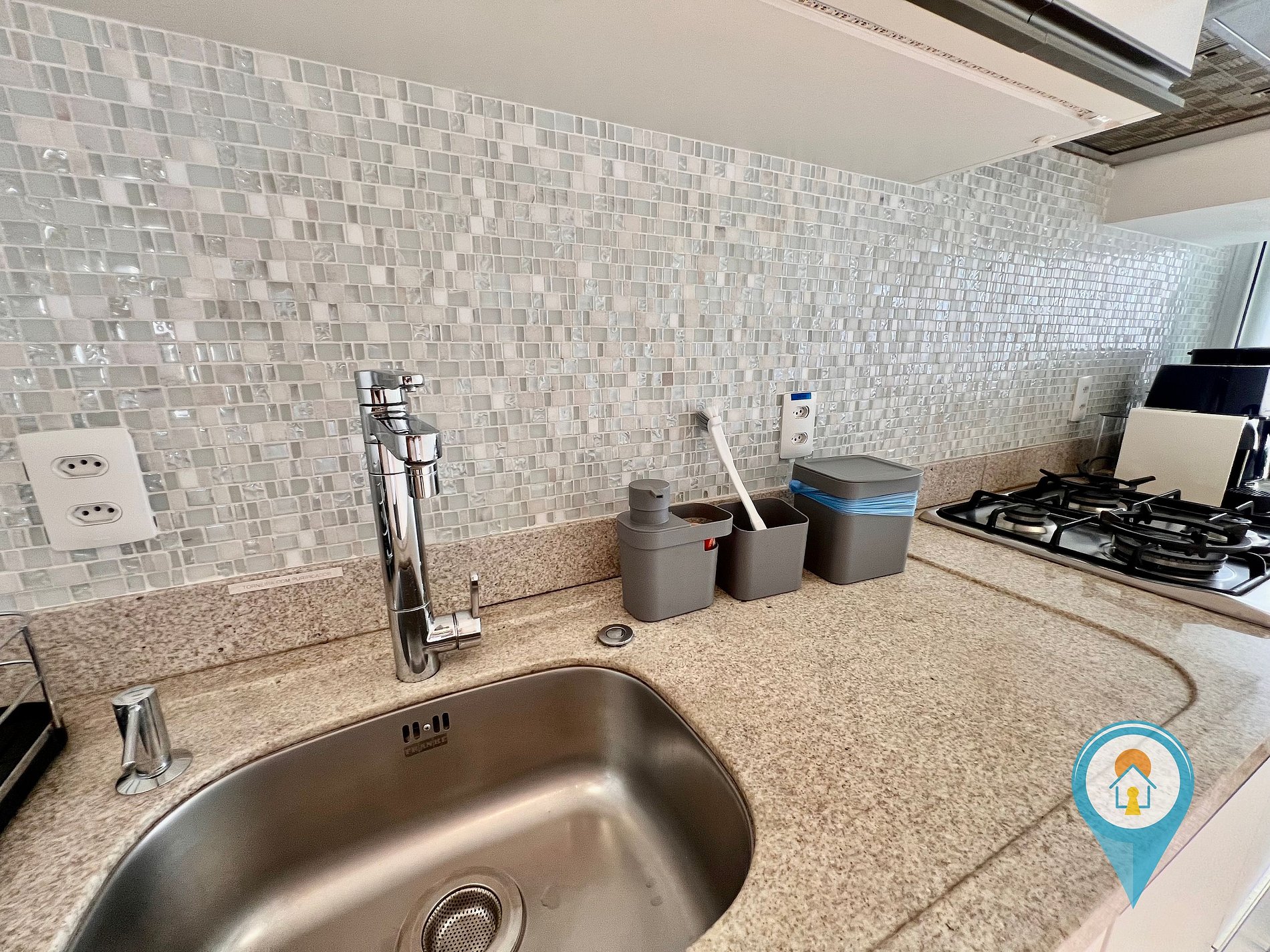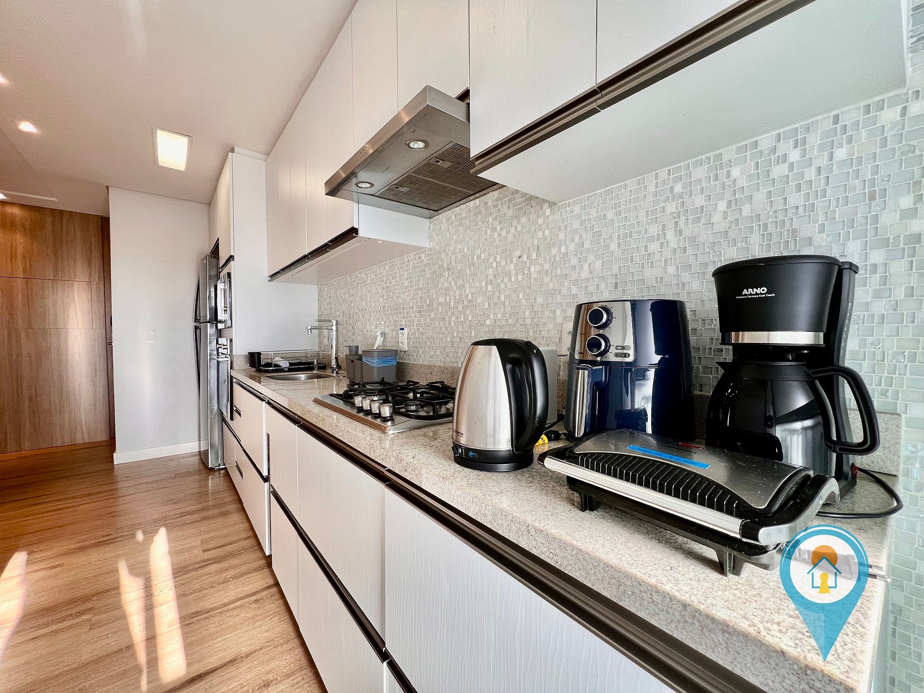 - Cozinha completa com utensílios, geladeira, fogão e pequenos eletros.