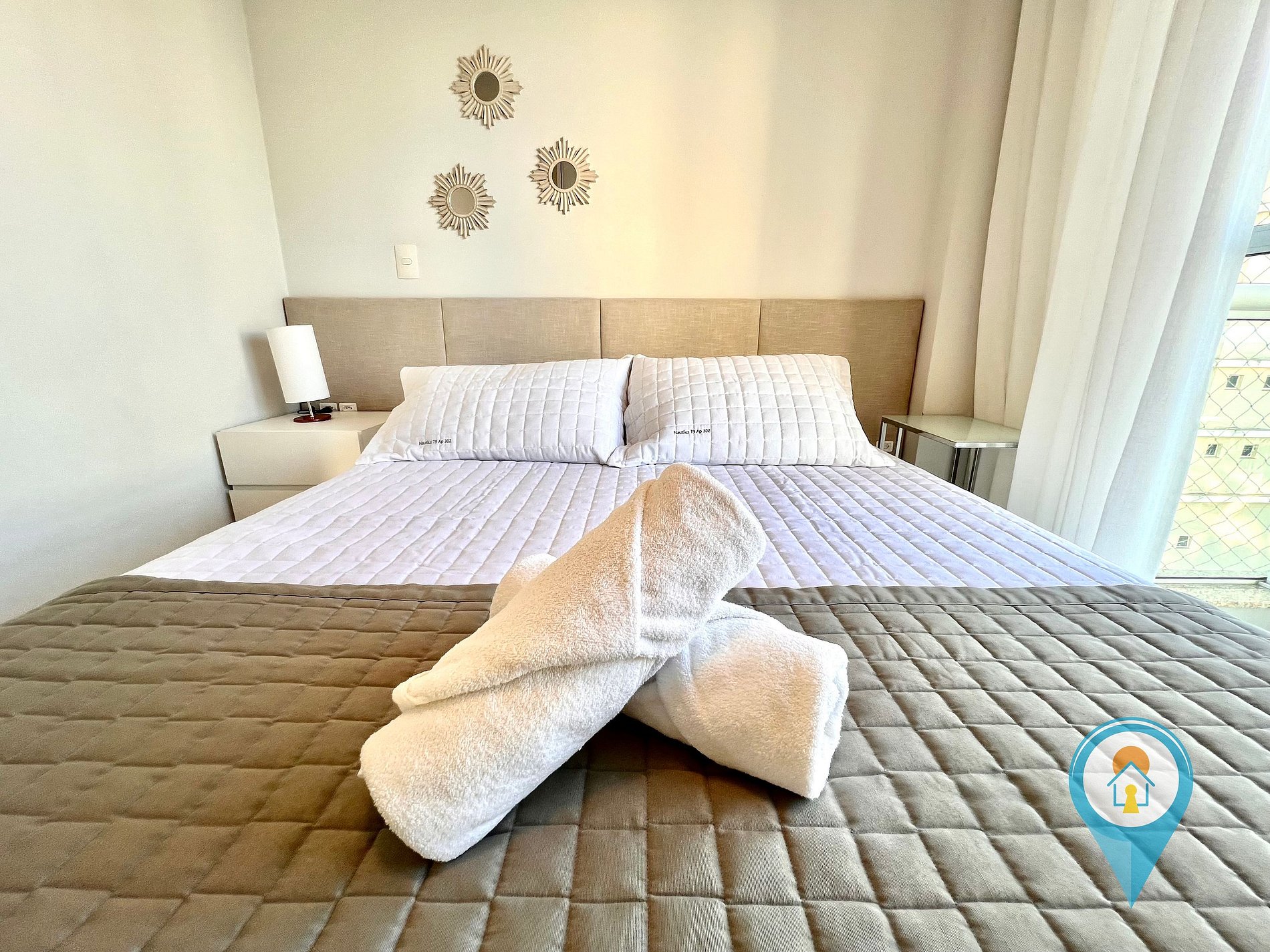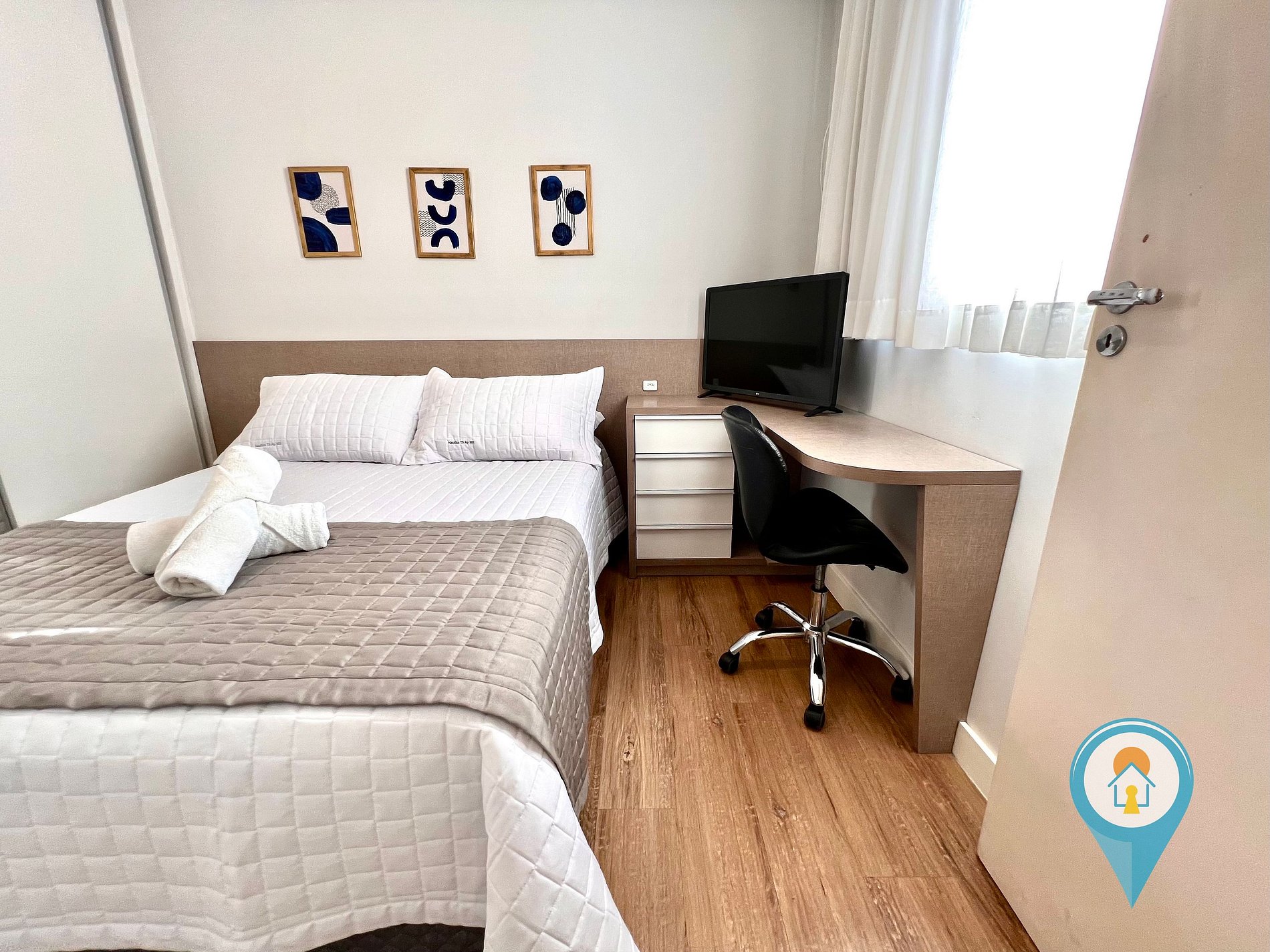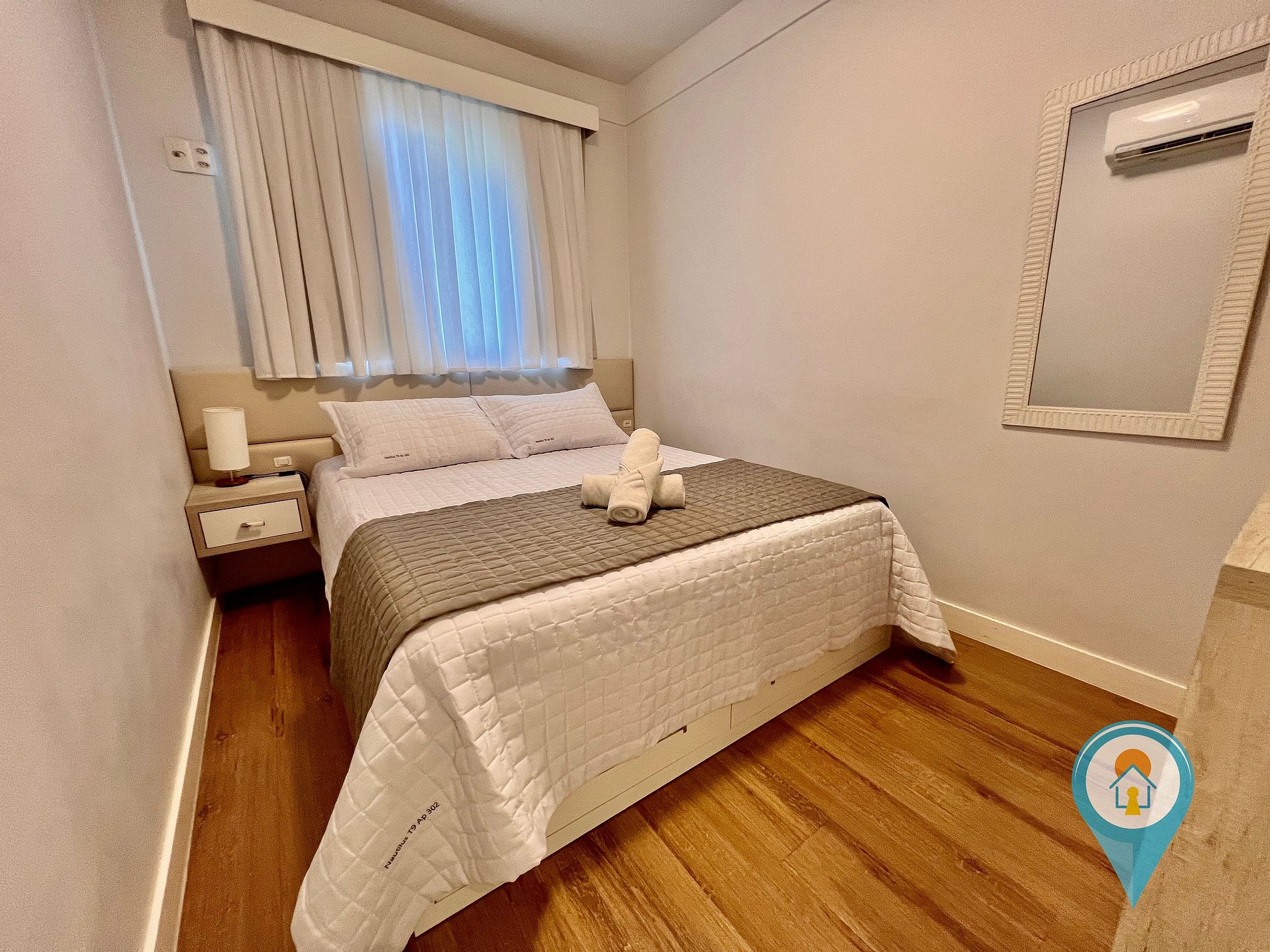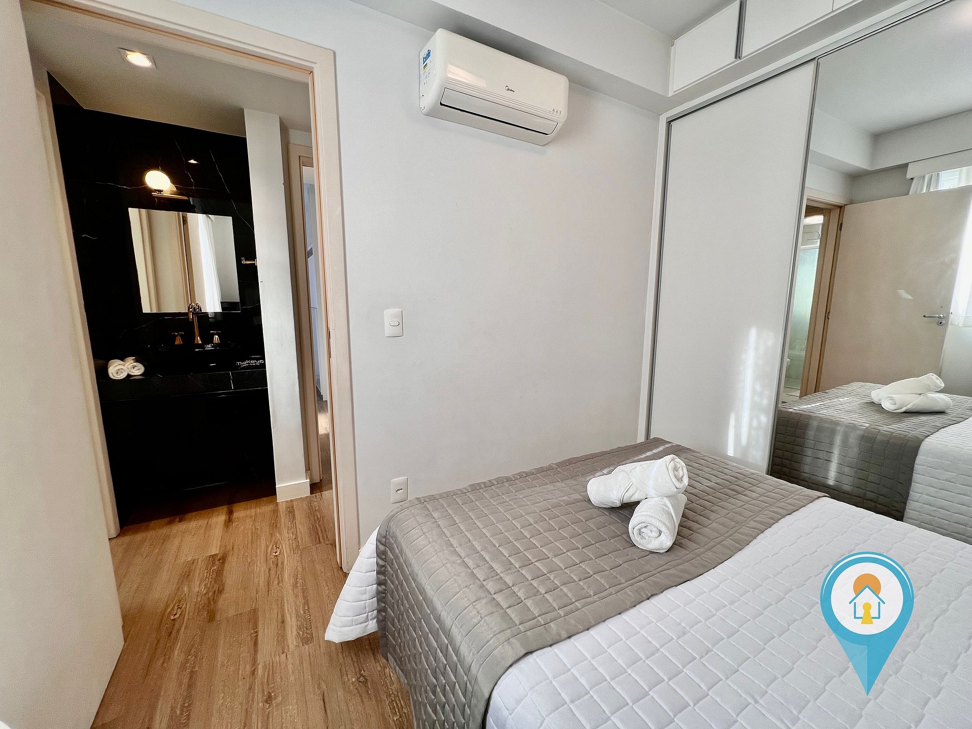 Quarto Casal 2: Equipado com Ar condicionado, Cama de Casal e móveis planejados + 1 colchão de solteiro extra.