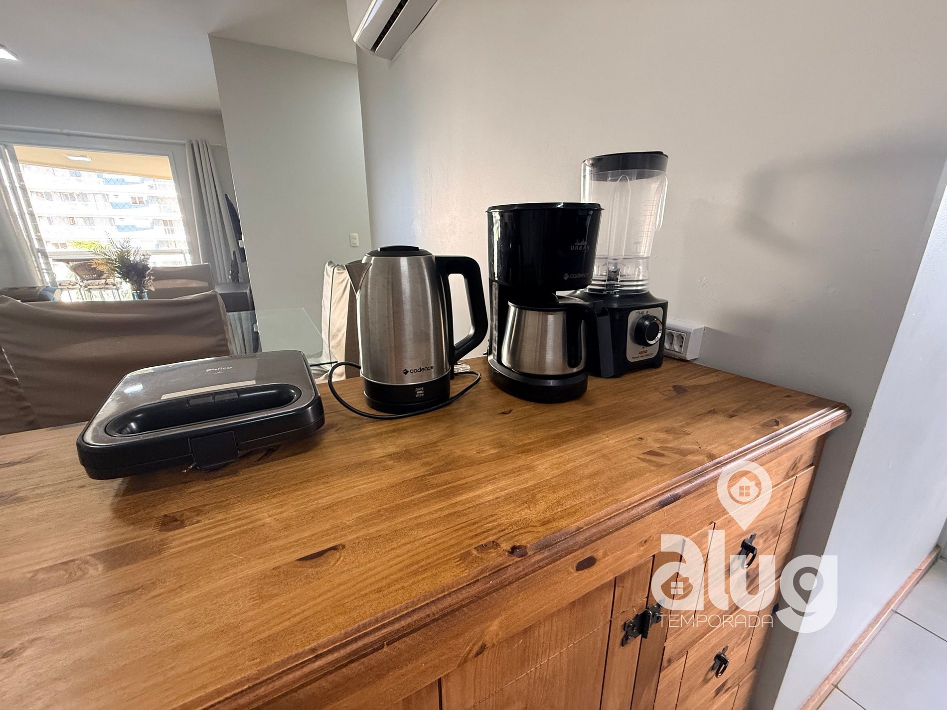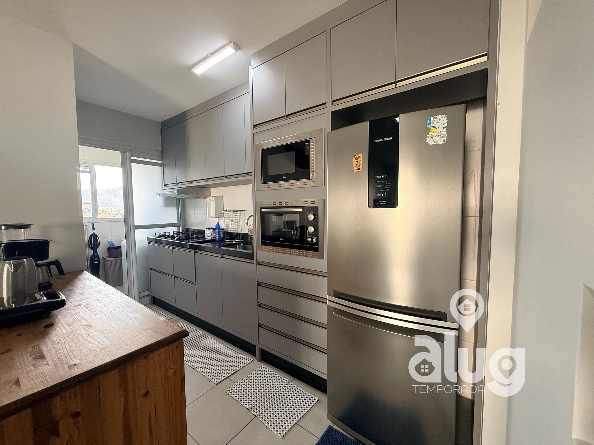 - Cozinha completa com utensílios, geladeira, fogão e pequenos eletros.