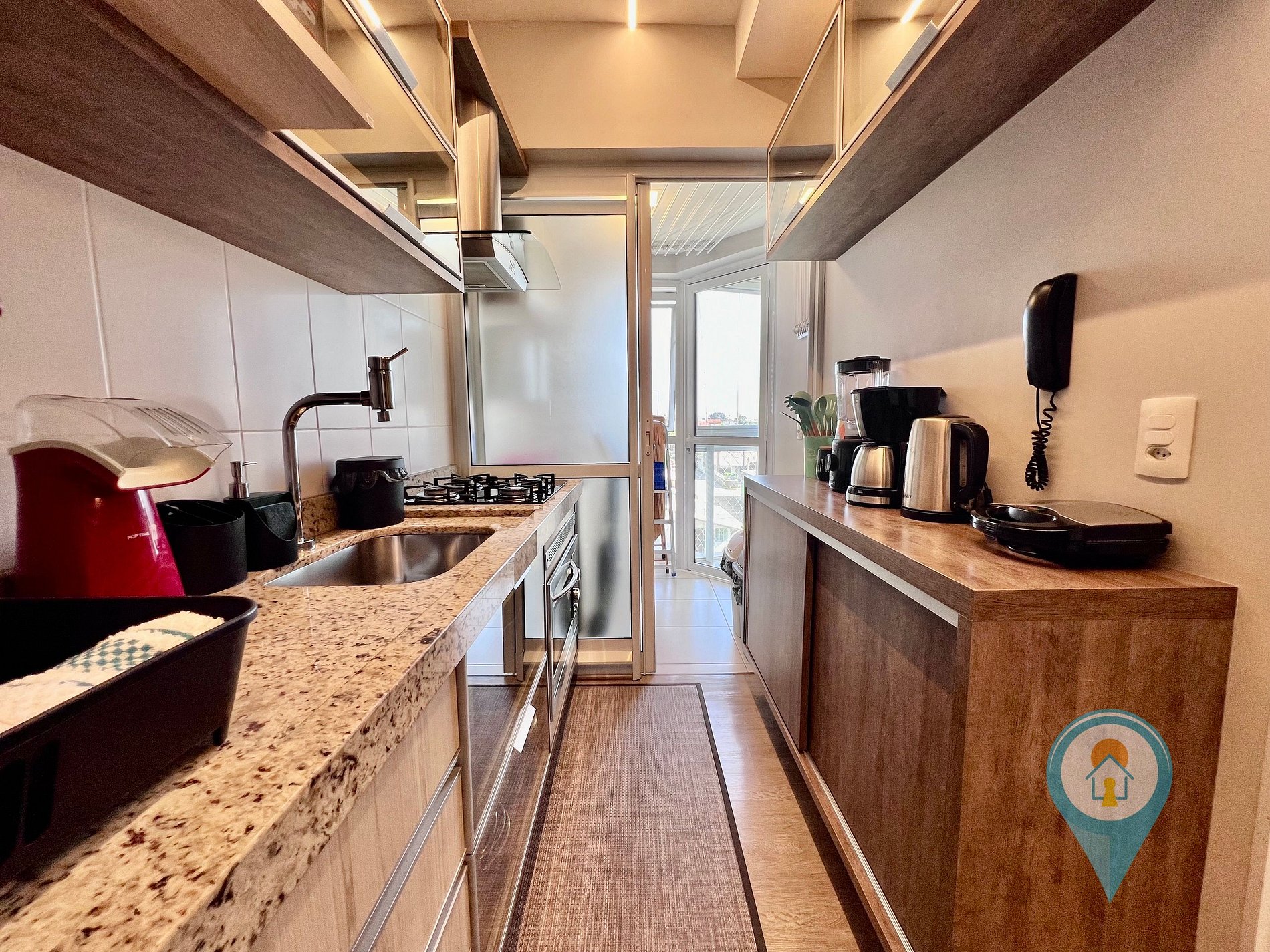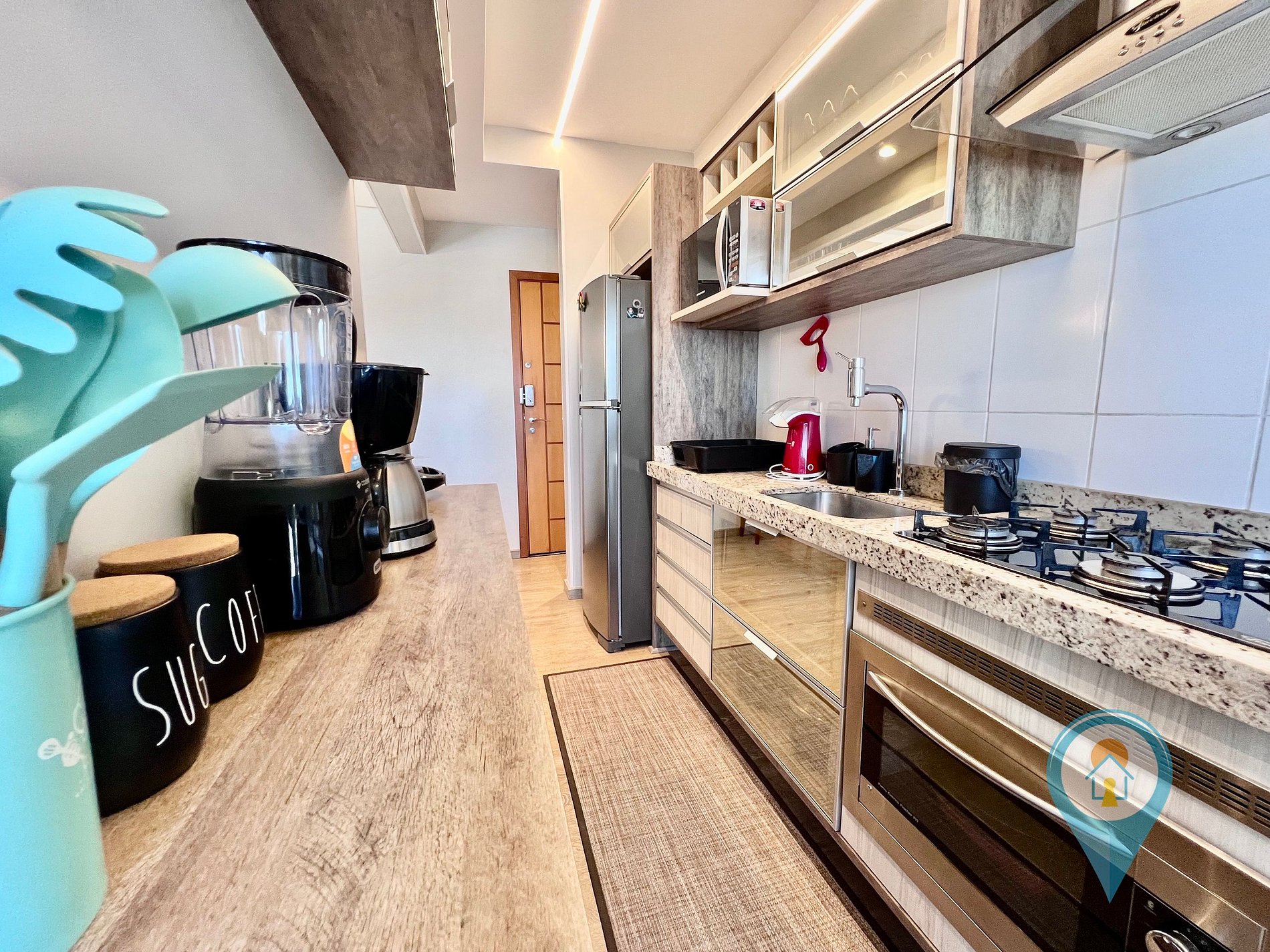 - Cozinha completa com utensílios, geladeira, fogão, microondas, cafeteira, sanduicheira, copos e talheres.