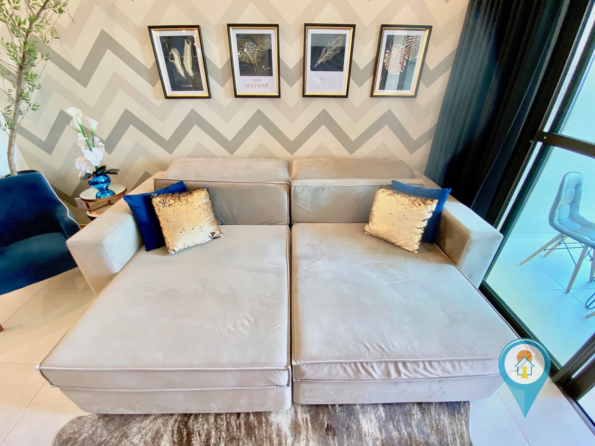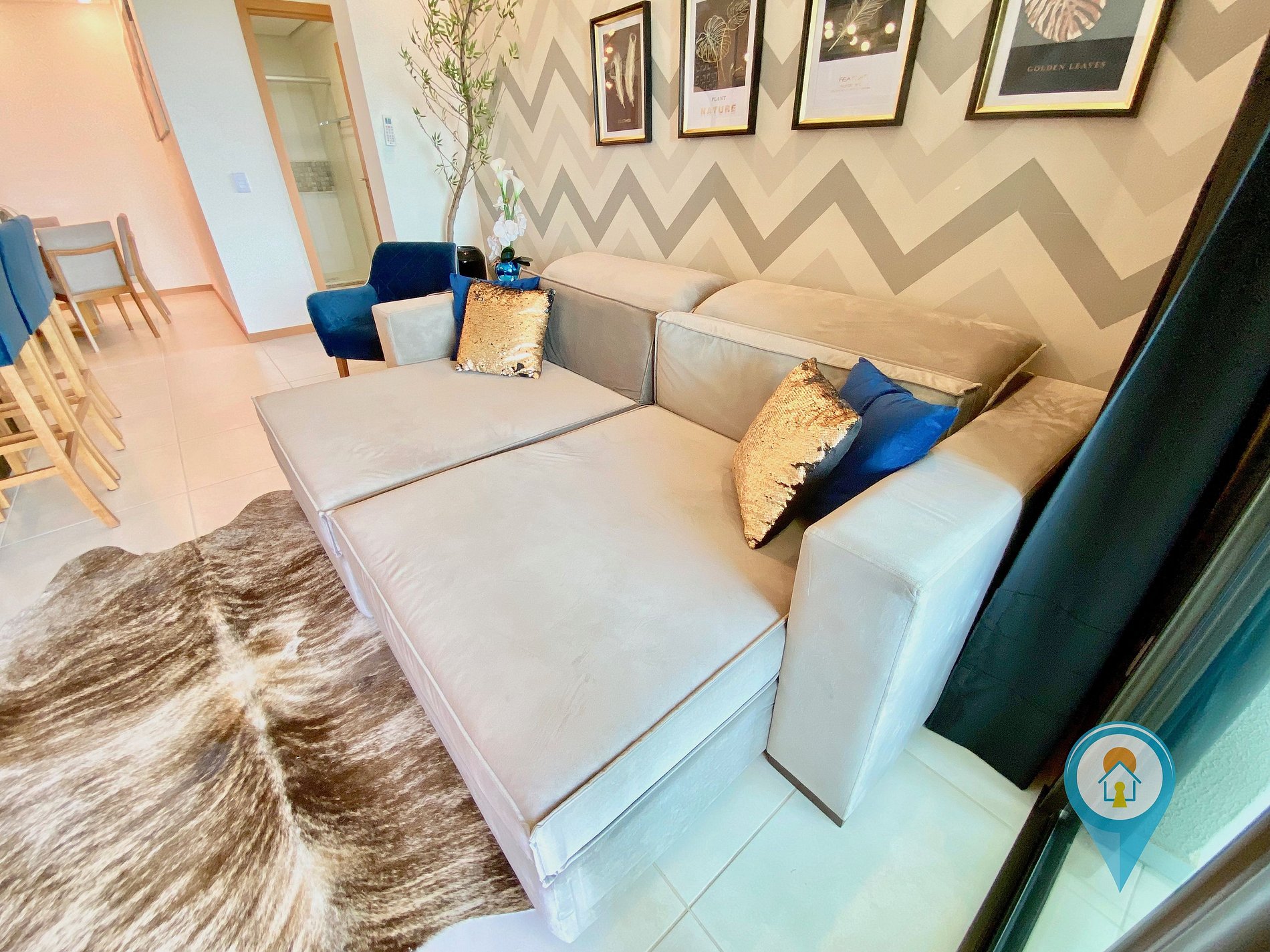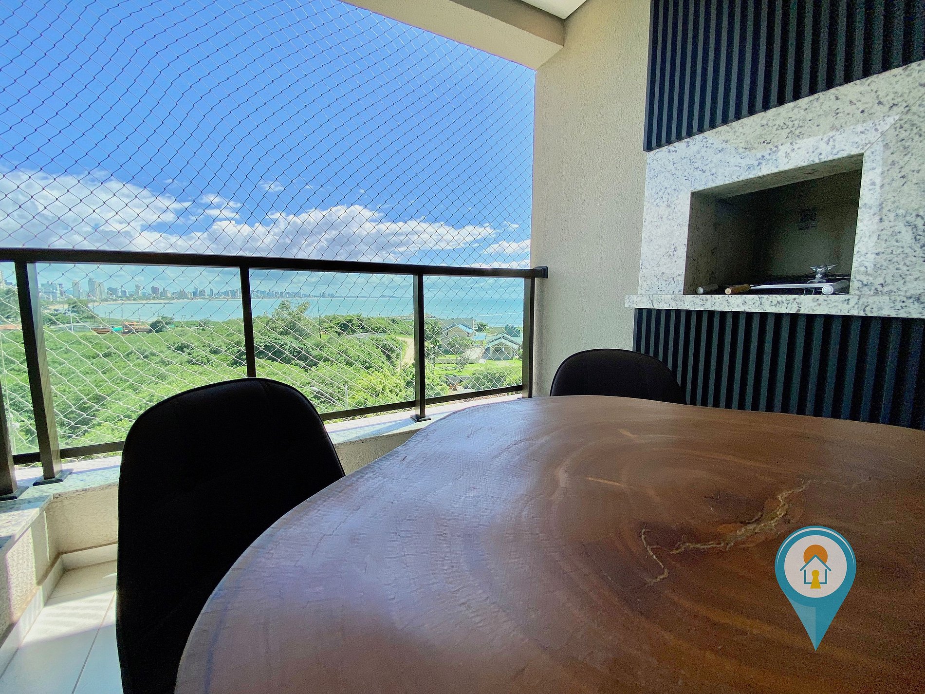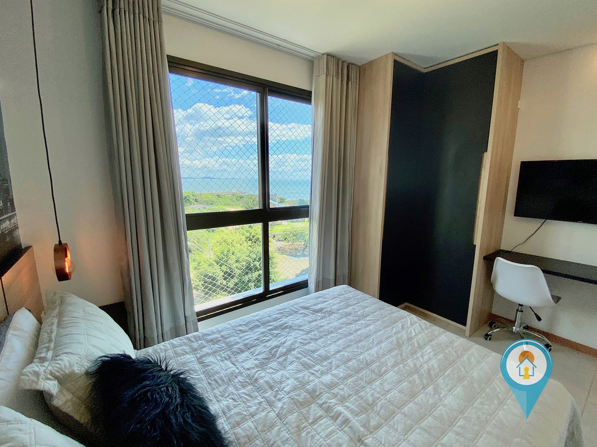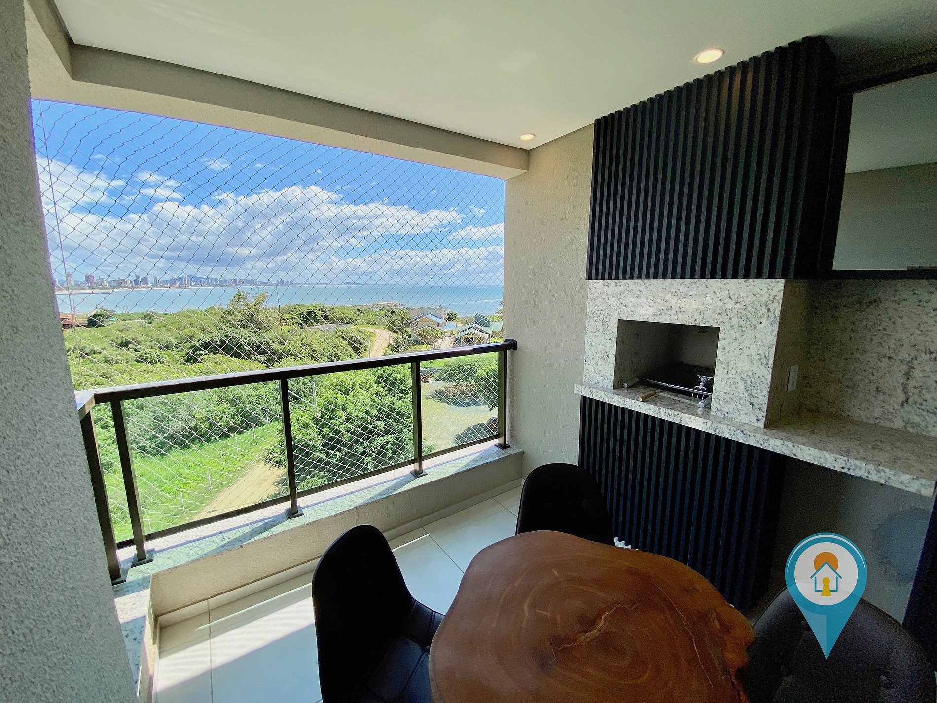 Apto com decoração moderna, vista para o mar e espaço de Trabalho/Estudos em todos os quartos.