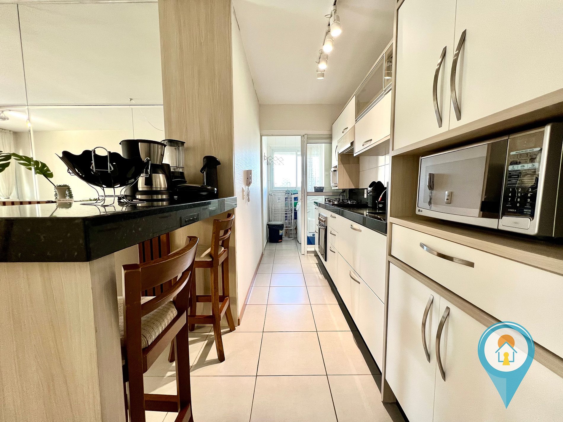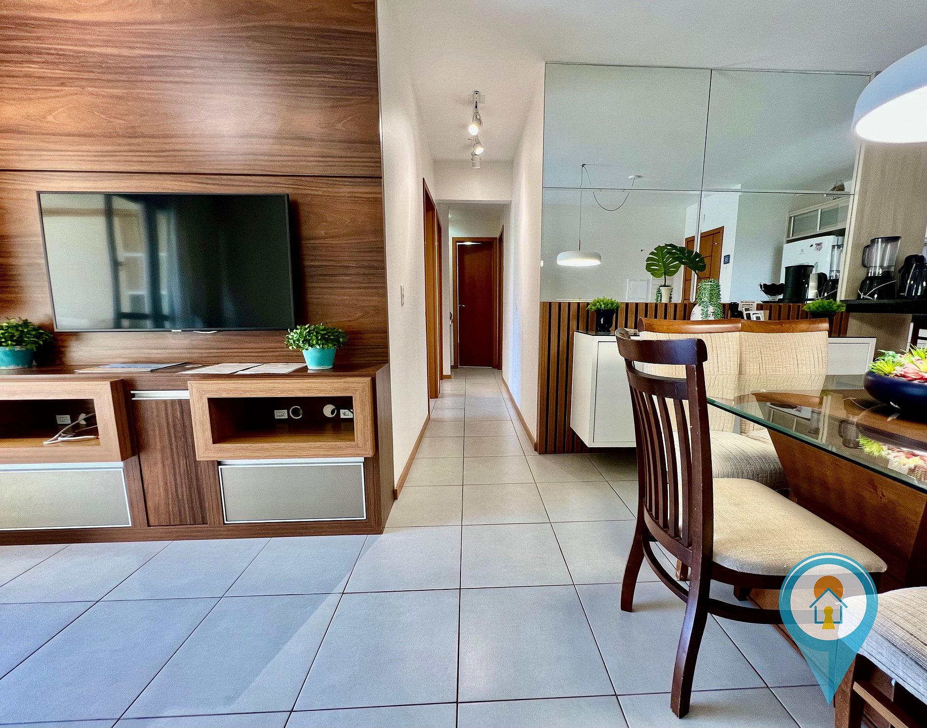 Na sala temos TV 40”, Confortável Sofá e mesa de jantar. Saindo da sala você tem acesso a uma excelente sacada com churrasqueira e tela de proteção para segurança das crianças.