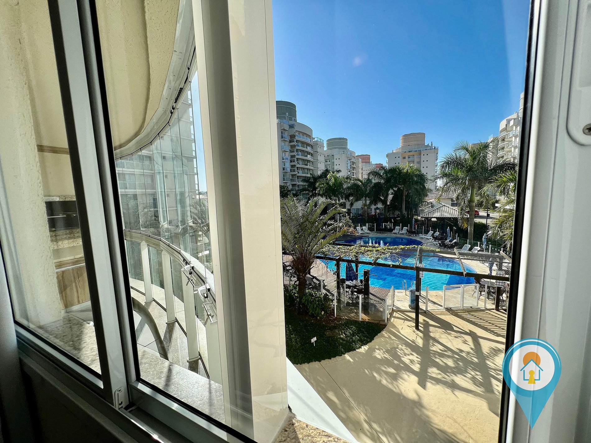 Suíte: Equipada com Ar condicionado, Cama de casal, sacada com tela de proteção e móveis.