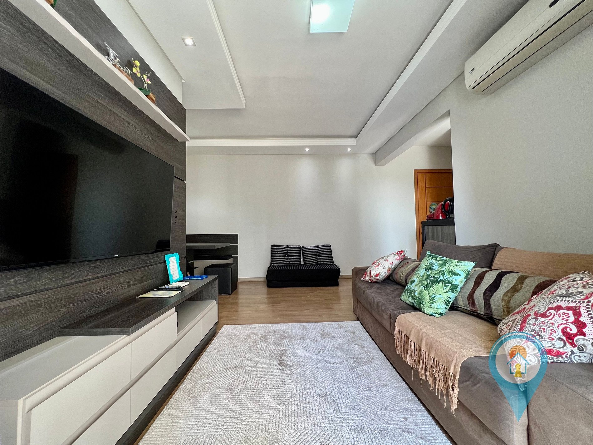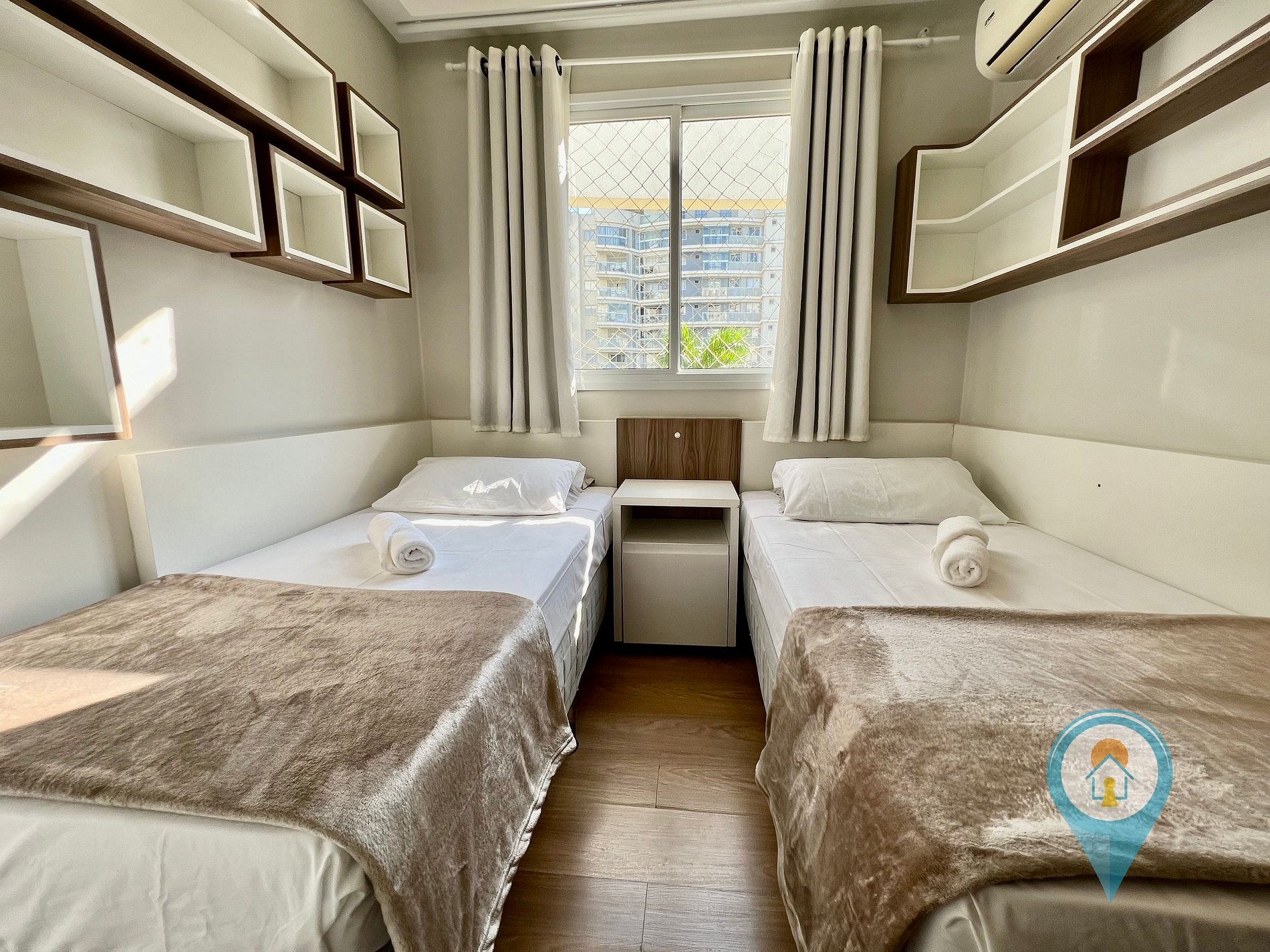 Quarto 1: Equipado com Ar condicionado, duas camas de solteiro, móveis planejados e colchão extra.