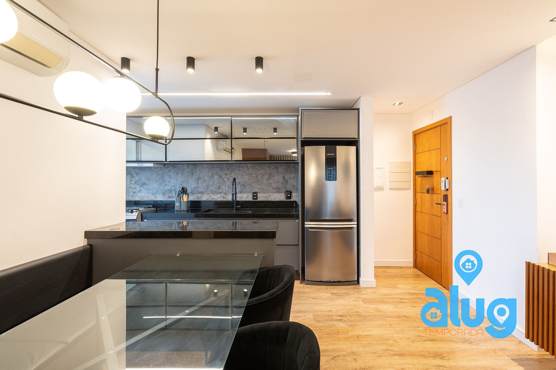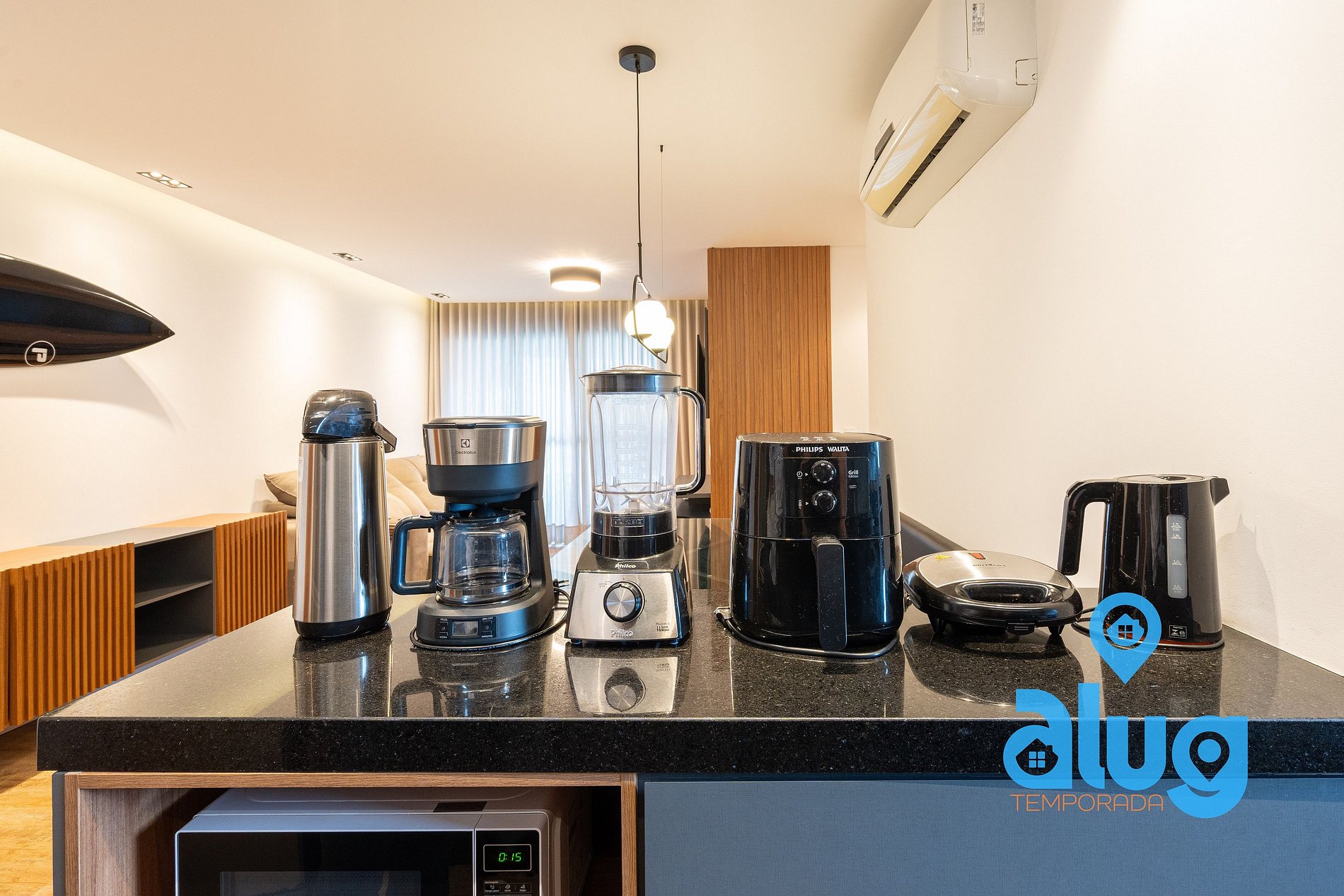 - Cozinha completa com utensílios, geladeira, fogão e pequenos eletros.