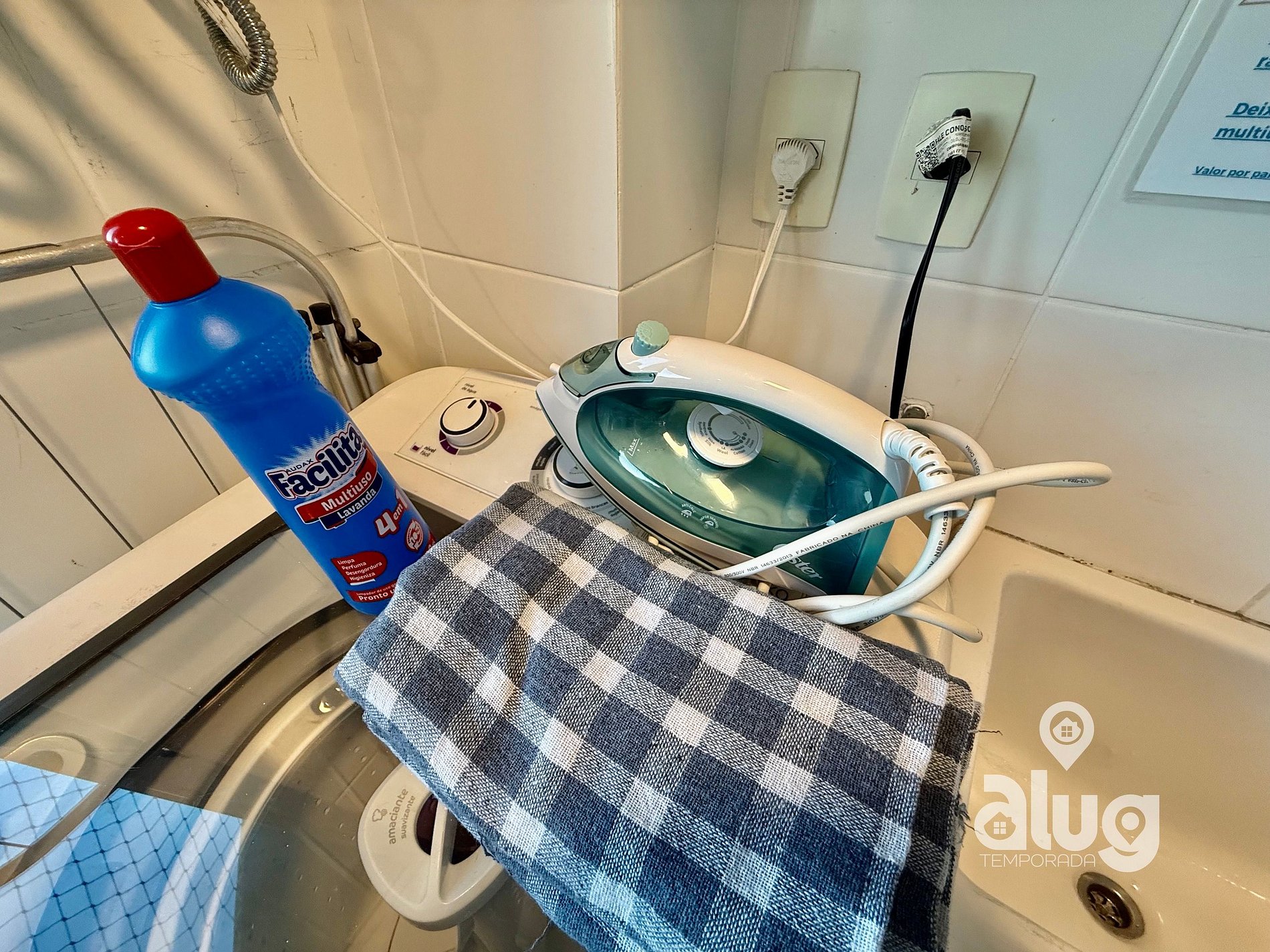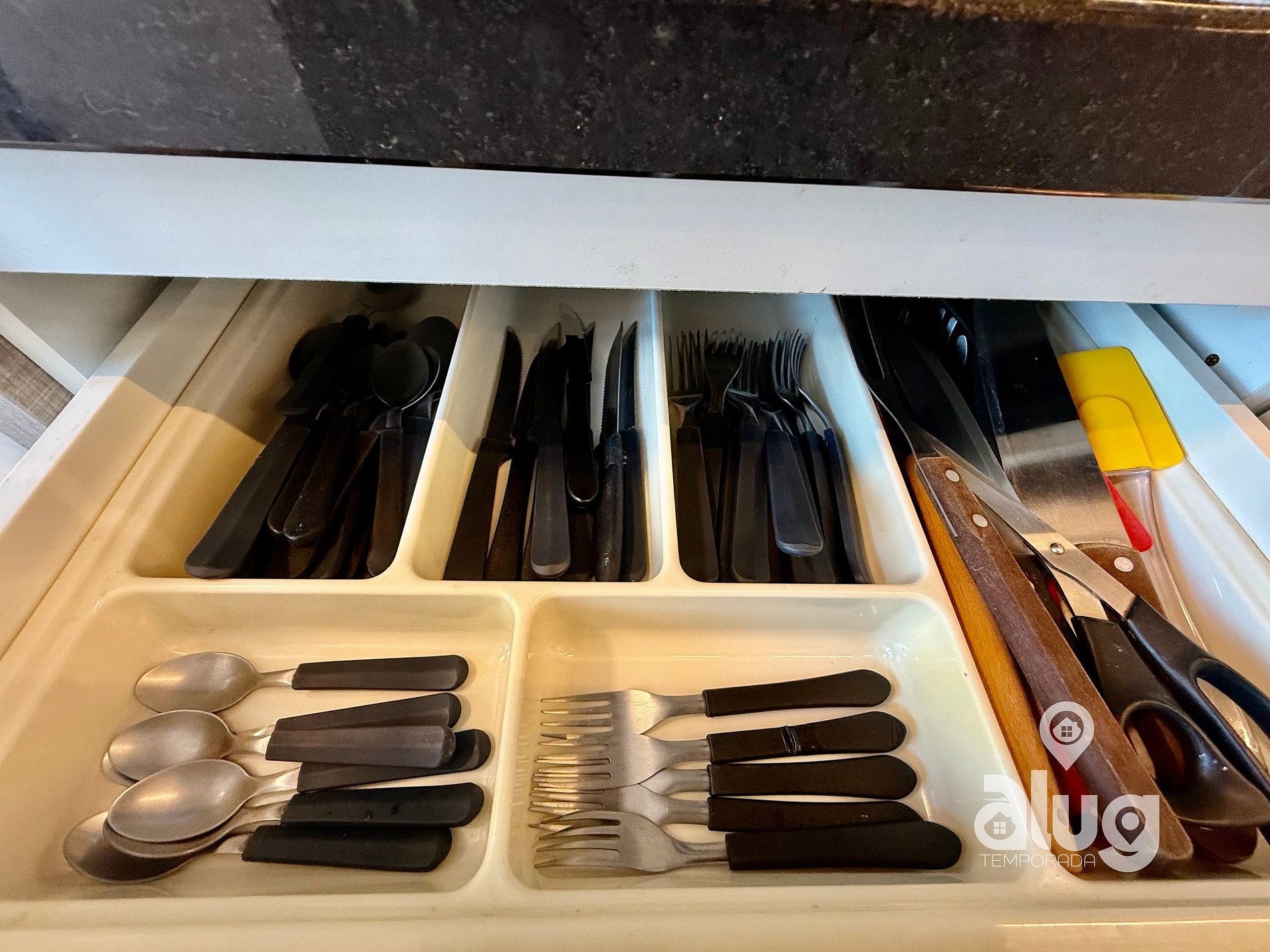 Oferecemos ainda todos os utensílios necessários para o dia a dia: pratos, copos, talheres, panelas, panos de prato, potes, utensílios para churrasco, faca, garfo e tábua de carne.