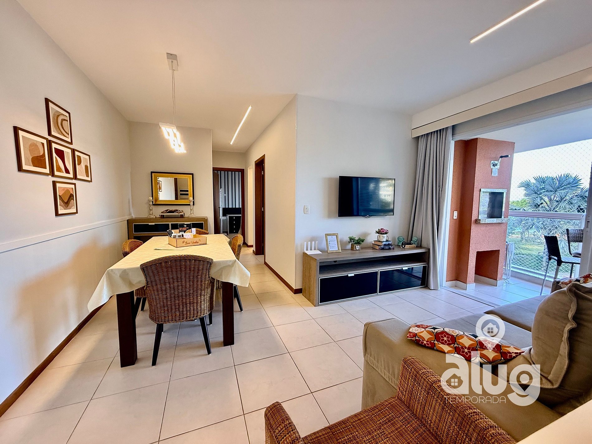 Sala de estar: ambiente acolhedor com ar-condicionado, Smart TV, sofá confortável e mesa de jantar para refeições em família.