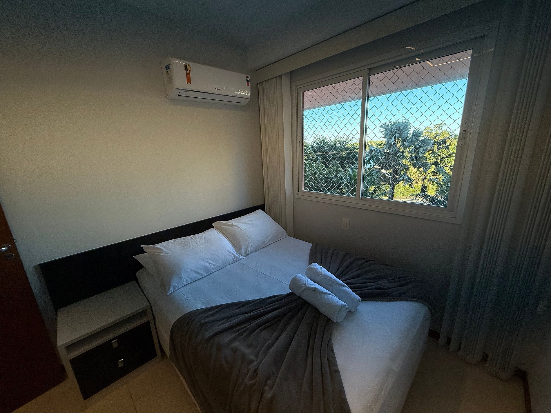 Segundo quarto: também com cama de casal, ar-condicionado e janela com tela de proteção, proporcionando segurança e bem-estar.