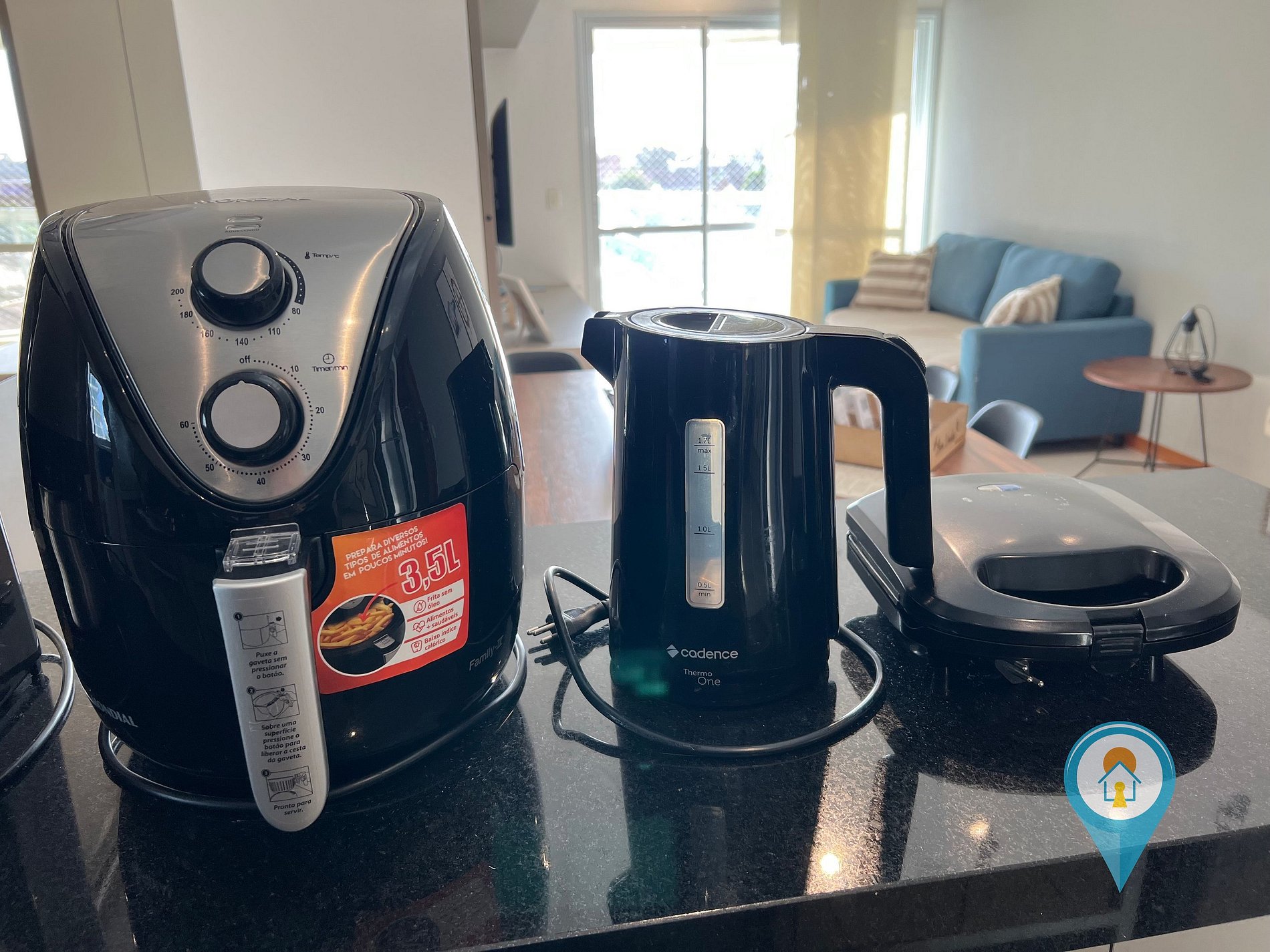 - Cozinha completa com utensílios, geladeira, fogão e pequenos eletros.