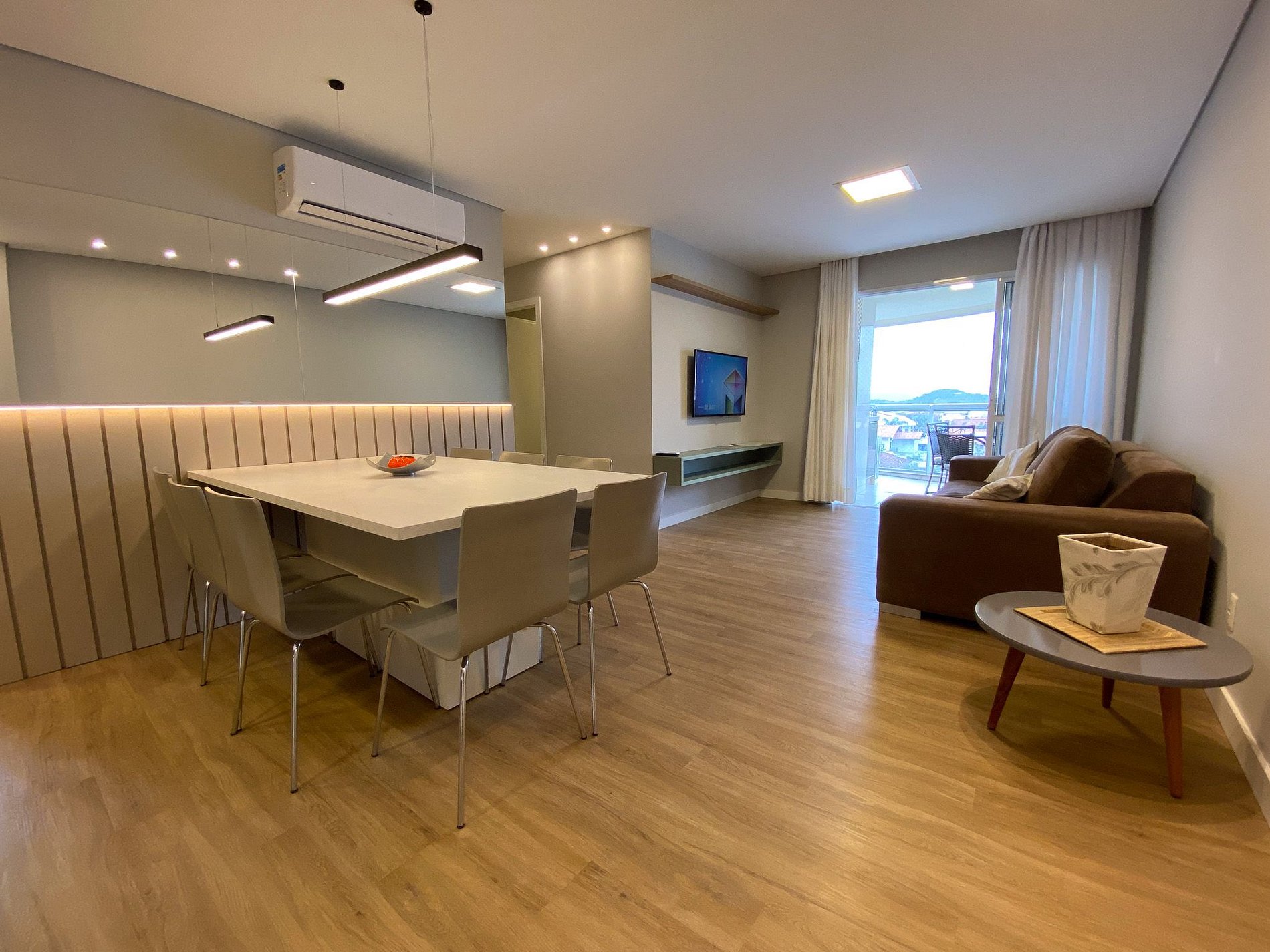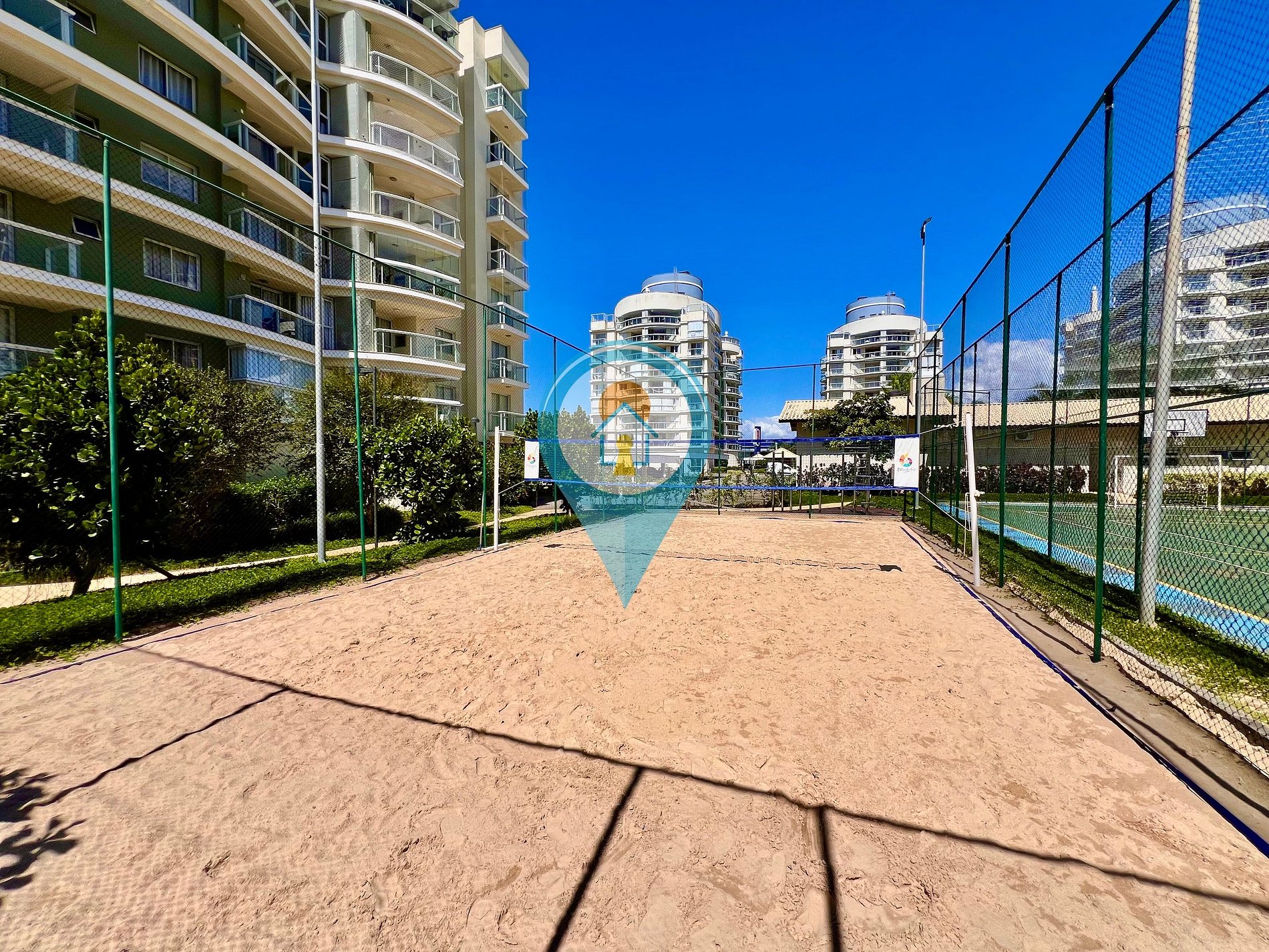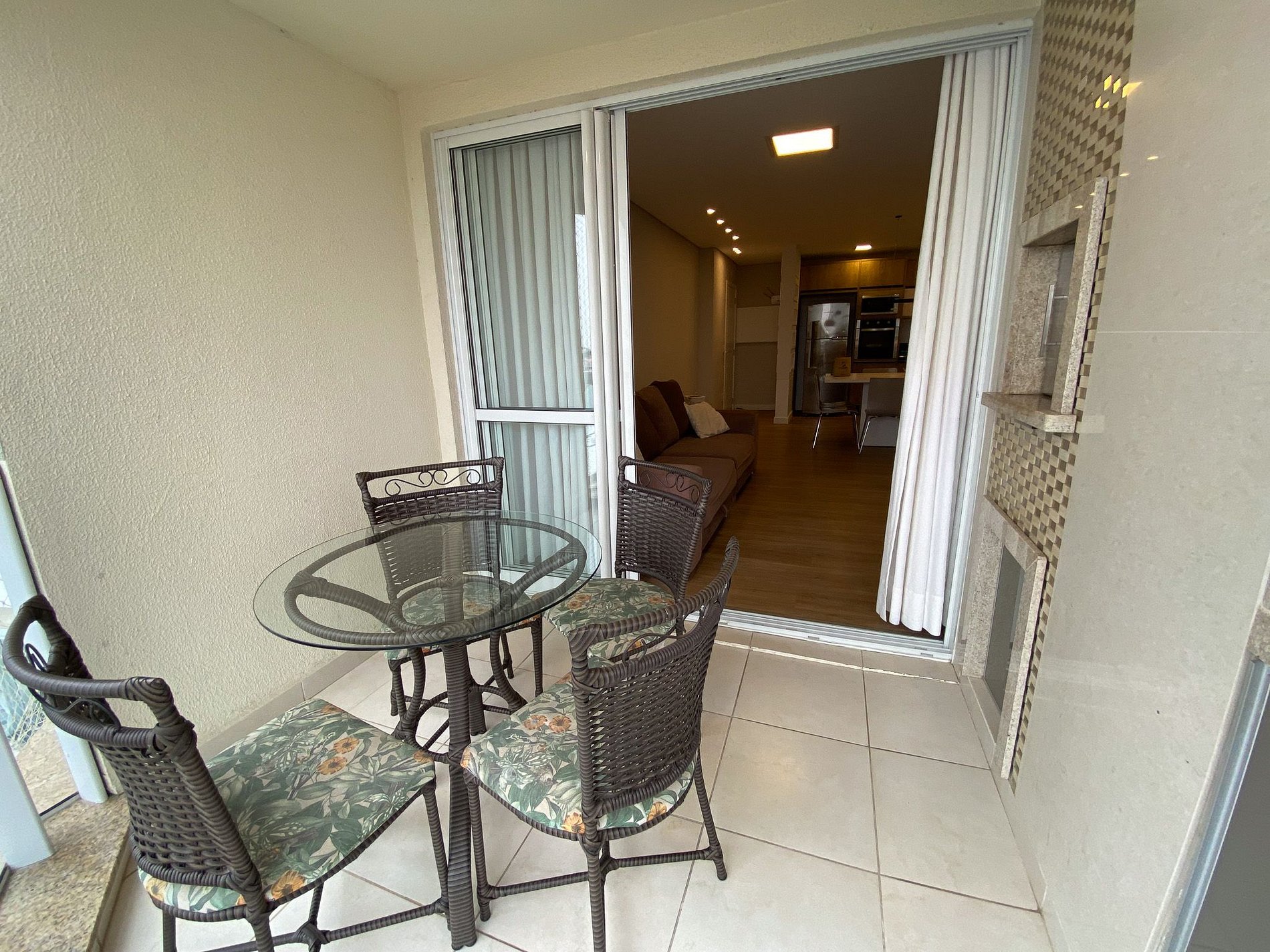O apto dispõe de cozinha completa e sacada com churrasqueira e vista para o mar