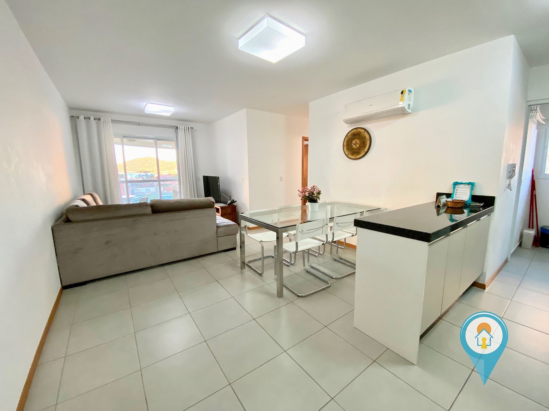 Na sala temos Ar condicionado, TV 43” e TV a cabo (Sky), Confortável Sofá e mesa de jantar. Saindo da sala você tem acesso a uma excelente sacada com churrasqueira e tela de proteção para segurança das crianças.