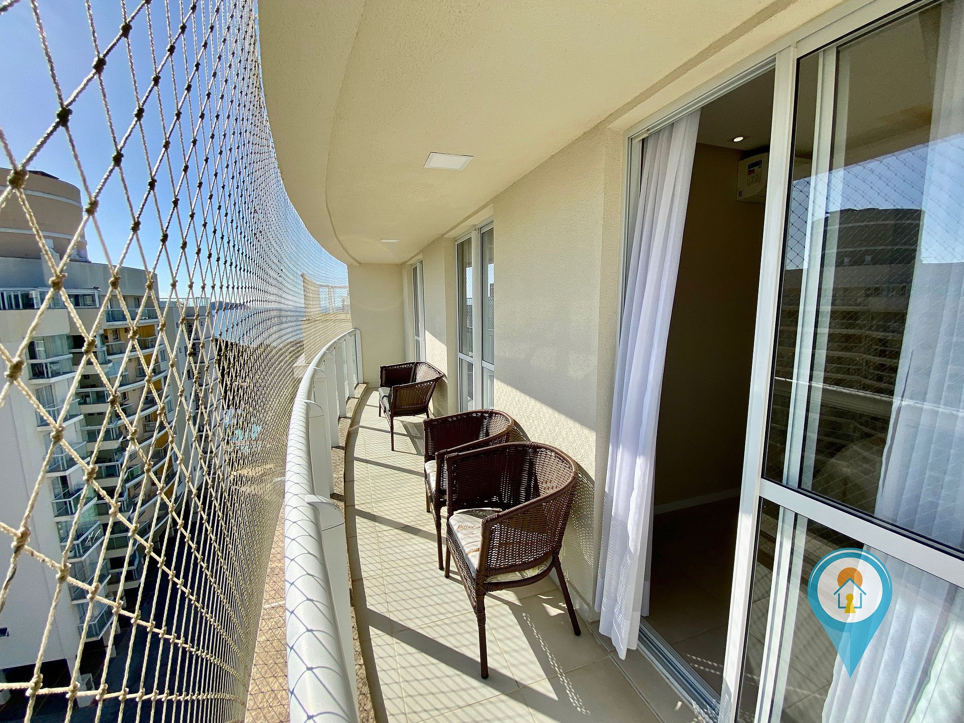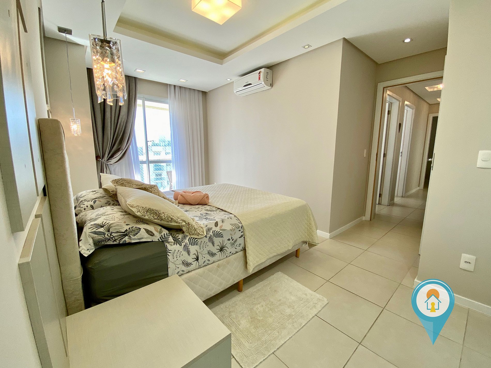 Suíte: Equipada com Ar condicionado, Cama de casal, sacada com tela de proteção e móveis.