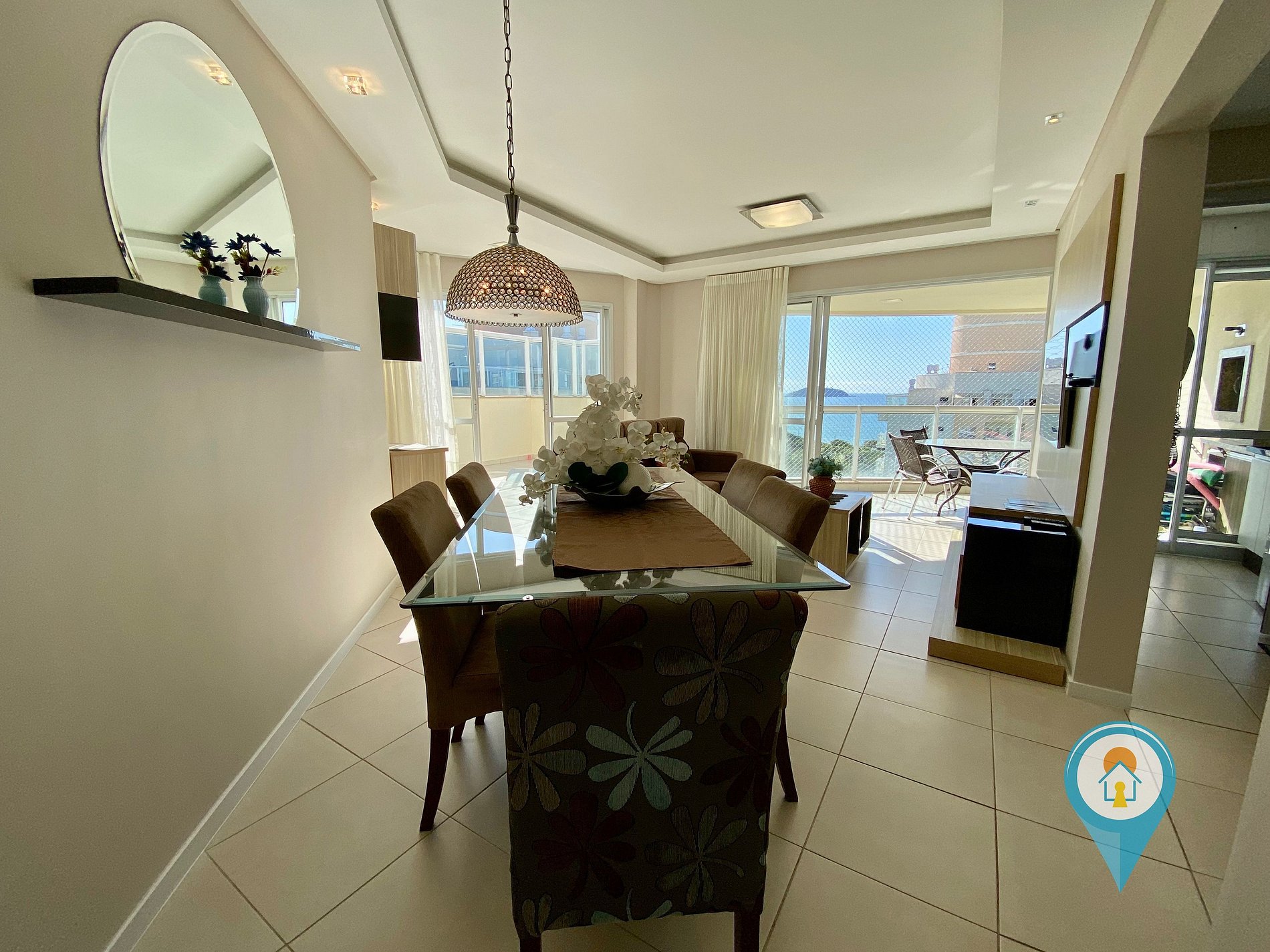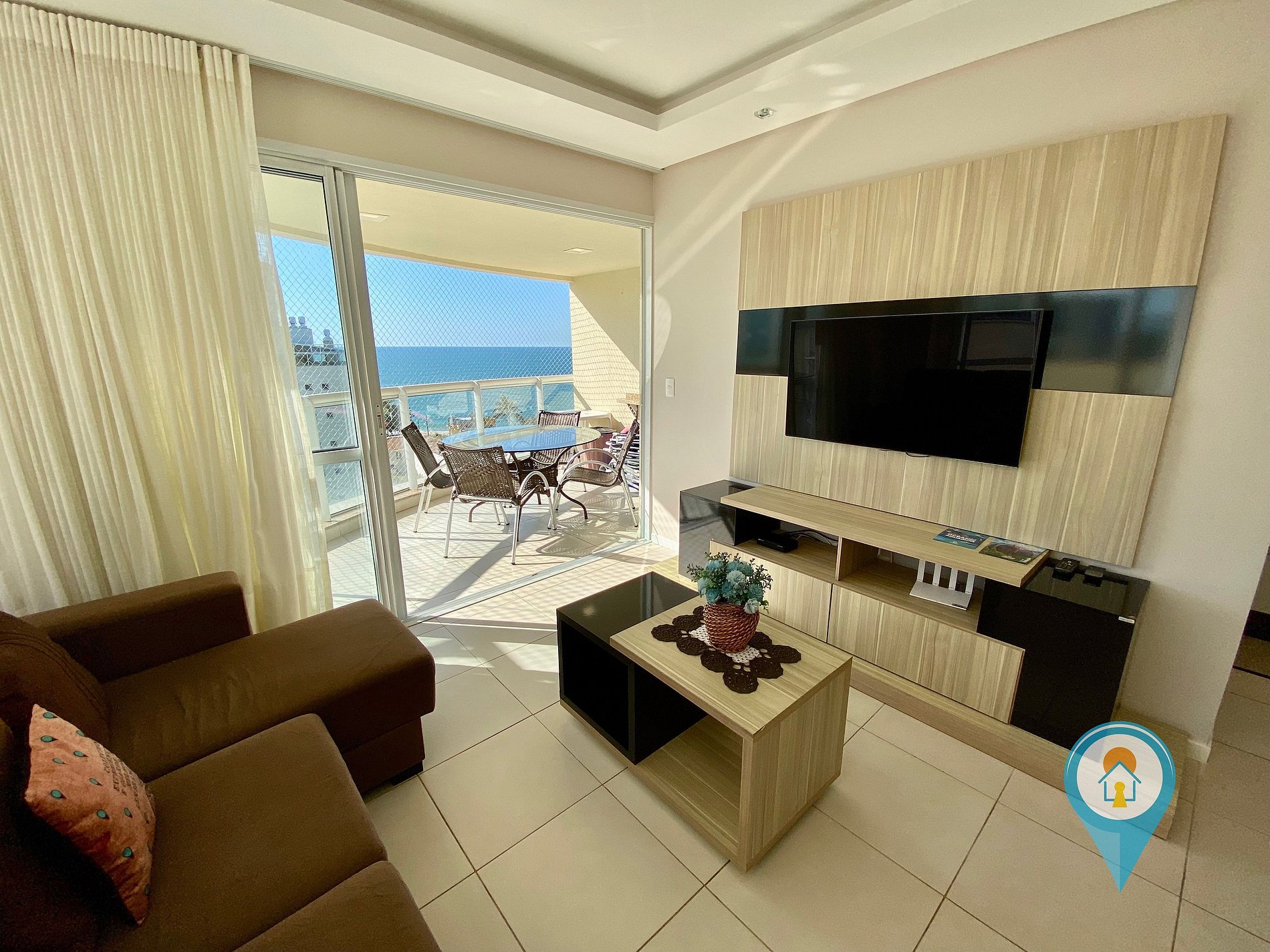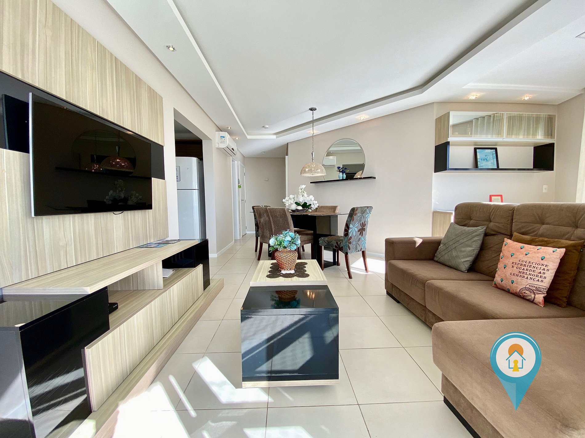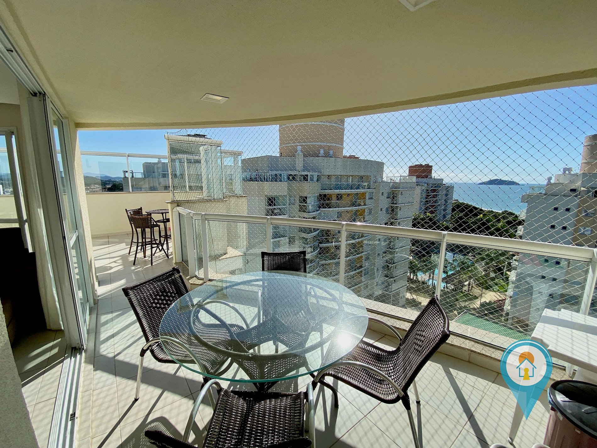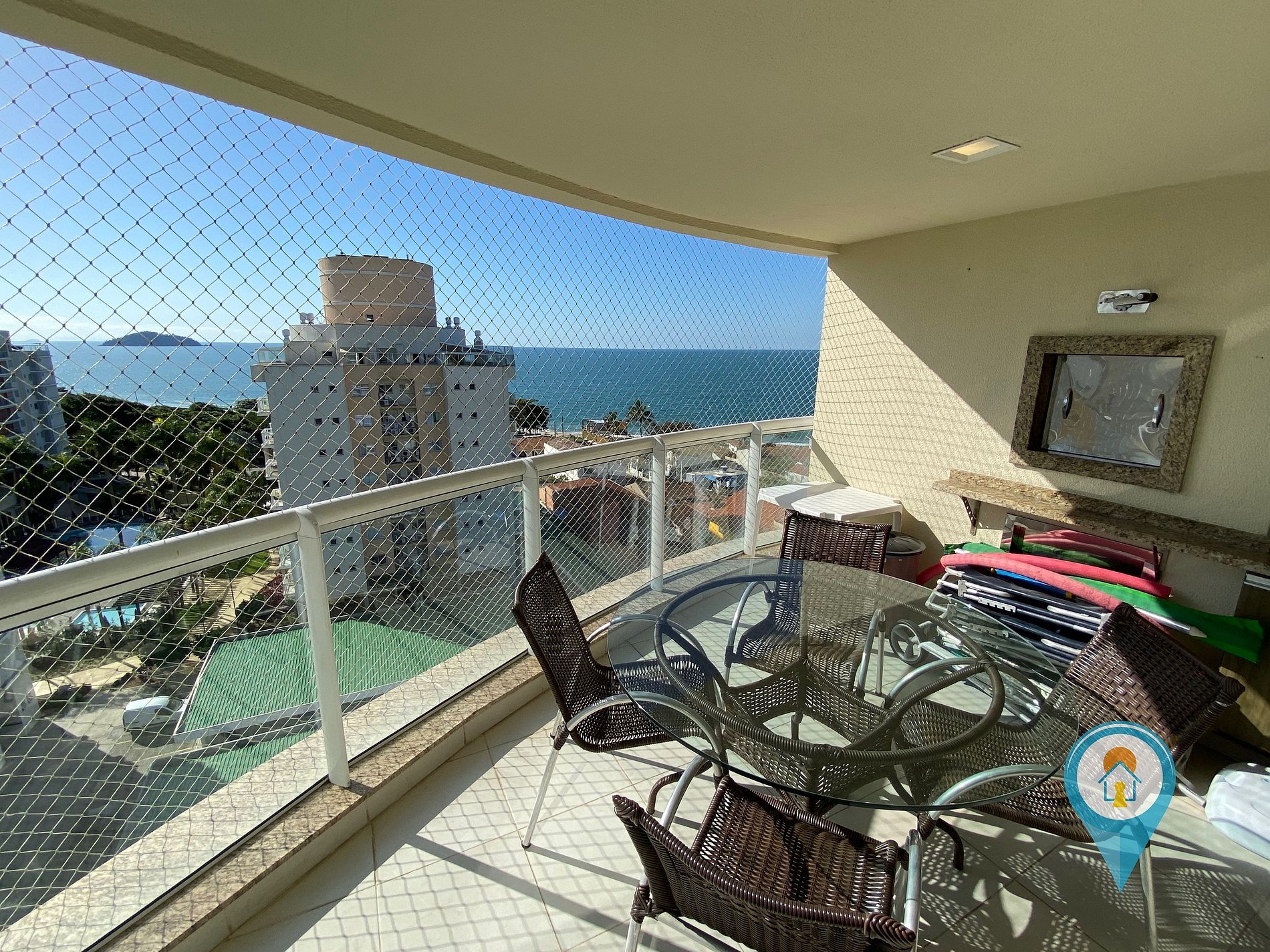 Na sala temos Ar condicionado, TV 43” e TV a cabo (Sky), Confortável Sofá e mesa de jantar. Saindo da sala você tem acesso a uma excelente sacada com churrasqueira e tela de proteção para segurança das crianças.
