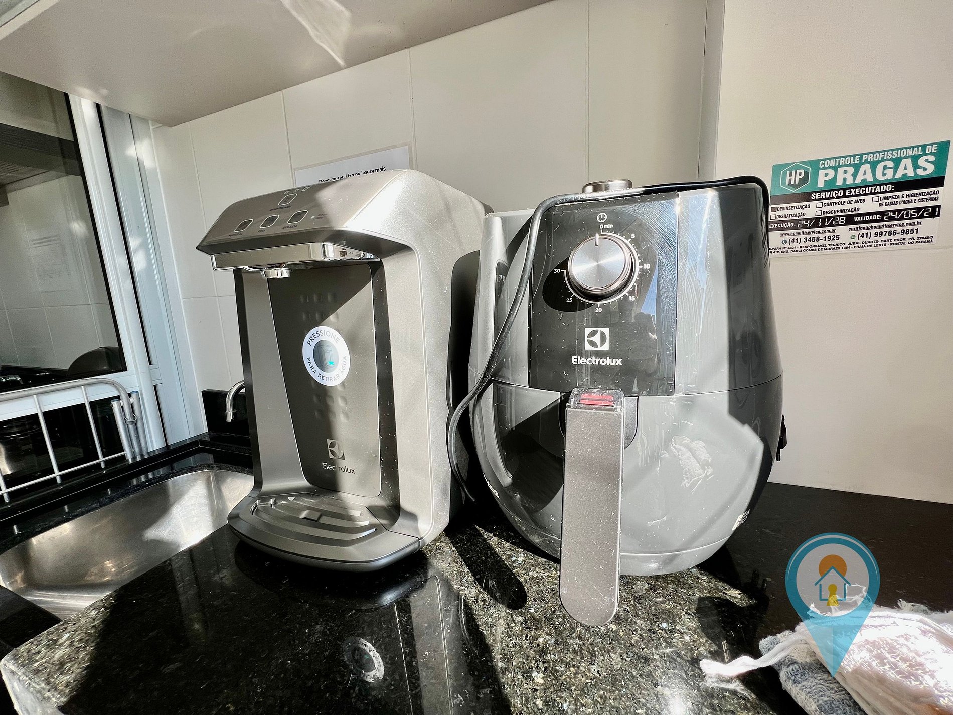 O apartamento dispõe de cozinha completa: Geladeira, microondas, fogão, cafeteira e outros eletros. Também inclui utensílios - pratos, copos, talheres, panelas, panos de prato, potes e utensílios de churrasco, faca, garfo e tábua de carne.