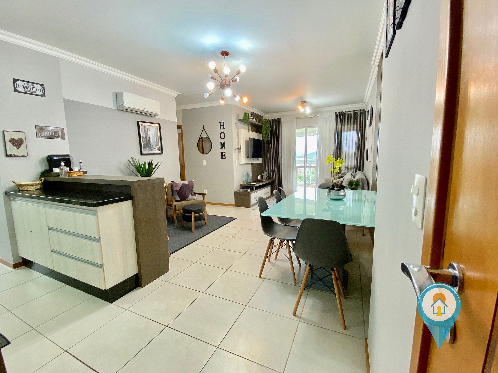 Na sala temos Ar condicionado, TV 40”, Confortável Sofá e mesa de jantar. Saindo da sala você tem acesso a uma excelente sacada com churrasqueira e tela de proteção para segurança das crianças.